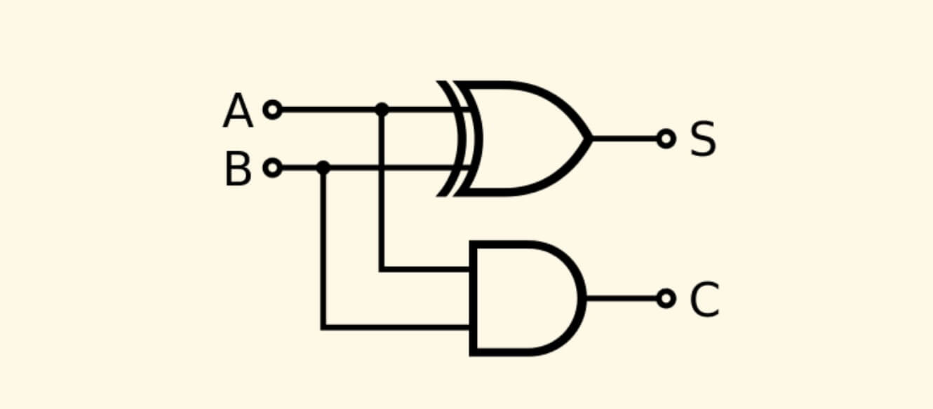 一位半加器 接收两个比特的输入,经过 异或门 输出当位的和 S ,经过 与门 输出进位 C 。