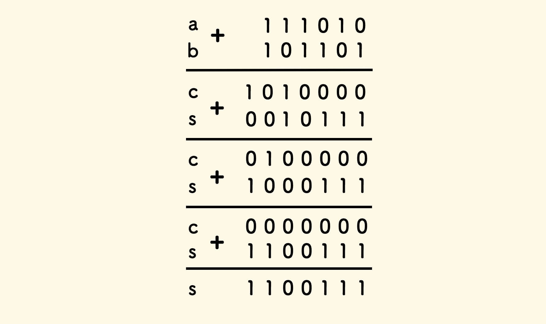 把进位的一栏记为 c ,不考虑进位的和记为 s 。