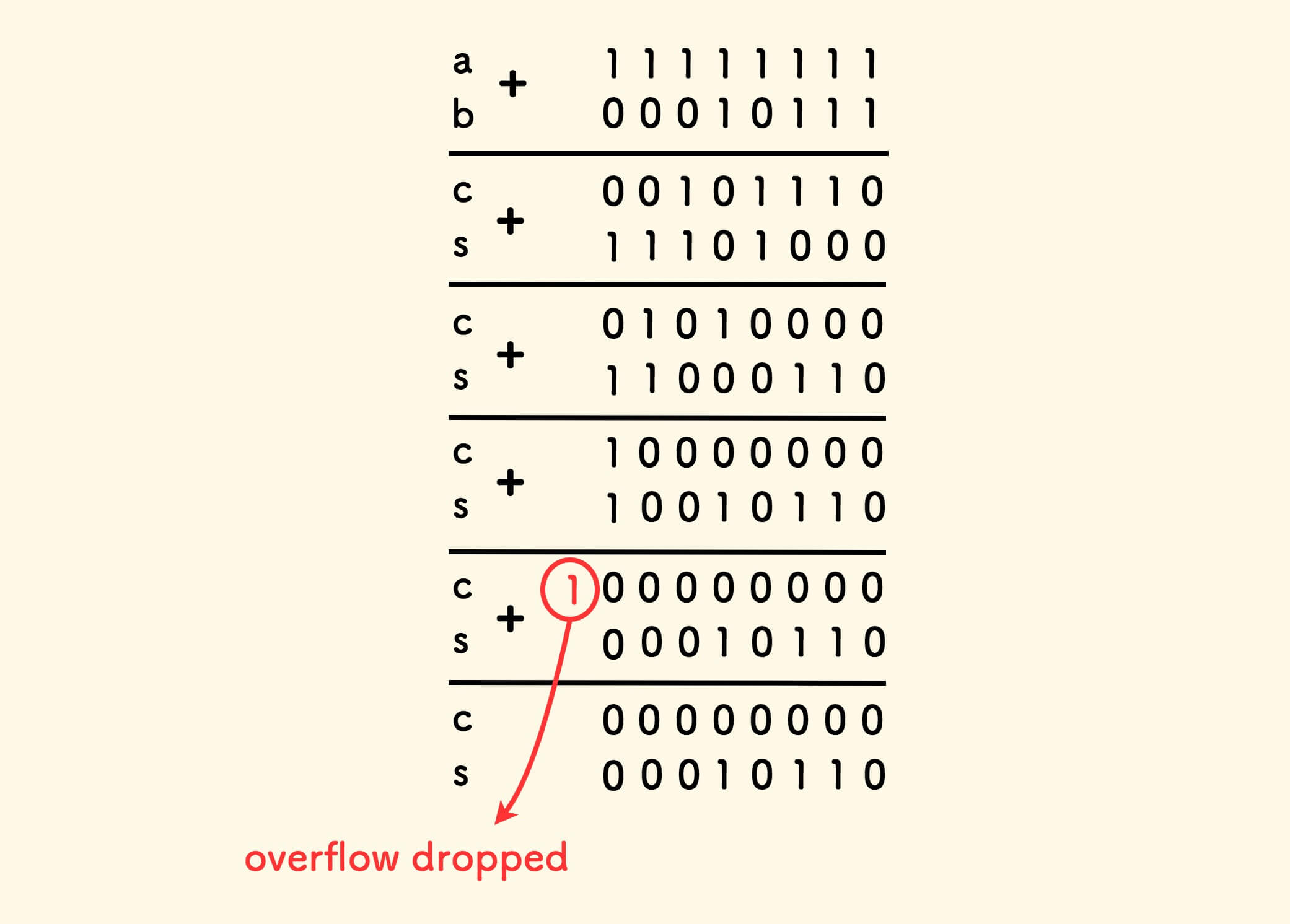 可以看到,不断迭代竖式计算,直到进位 c 为 0 的时候,s 即最终的计算结果。