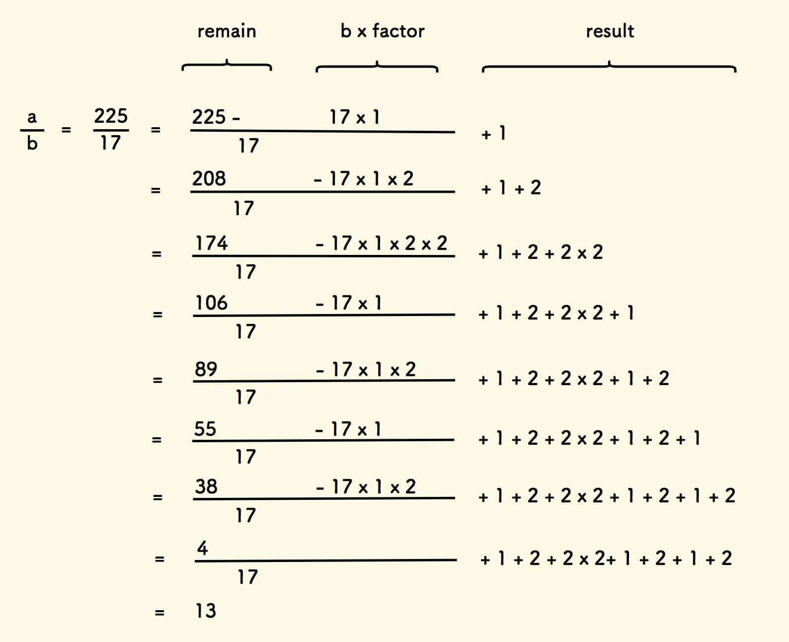 factor加到左边的result中,剩余倍数减一。