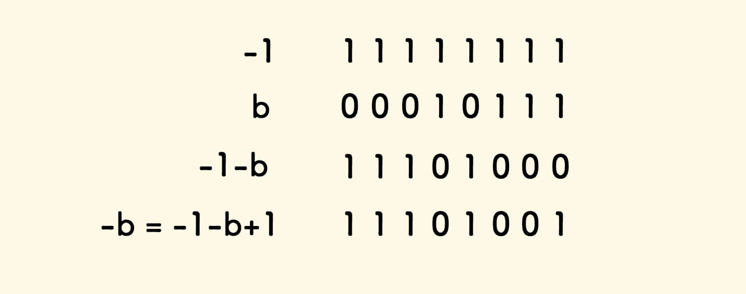 以 8bit 有符号整数为例,假如 b = 10111 ,那么 -b 可以如下得出:
