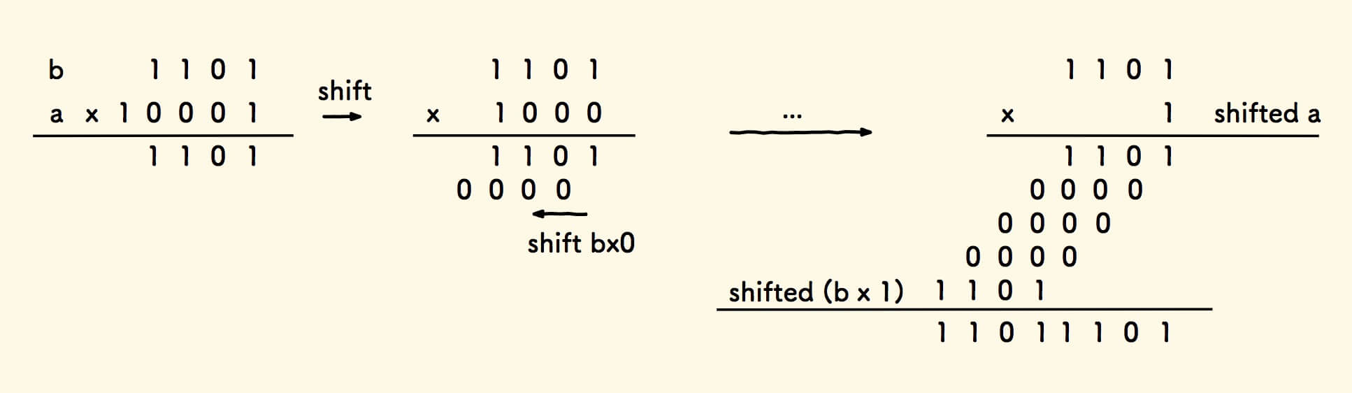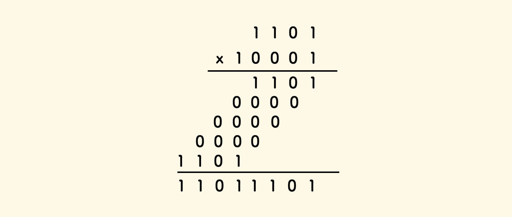 相比十进制乘法,它更简单,0 乘以任何数是 0 ,1 乘以任何数是自身, 用不到乘法九九算术表: