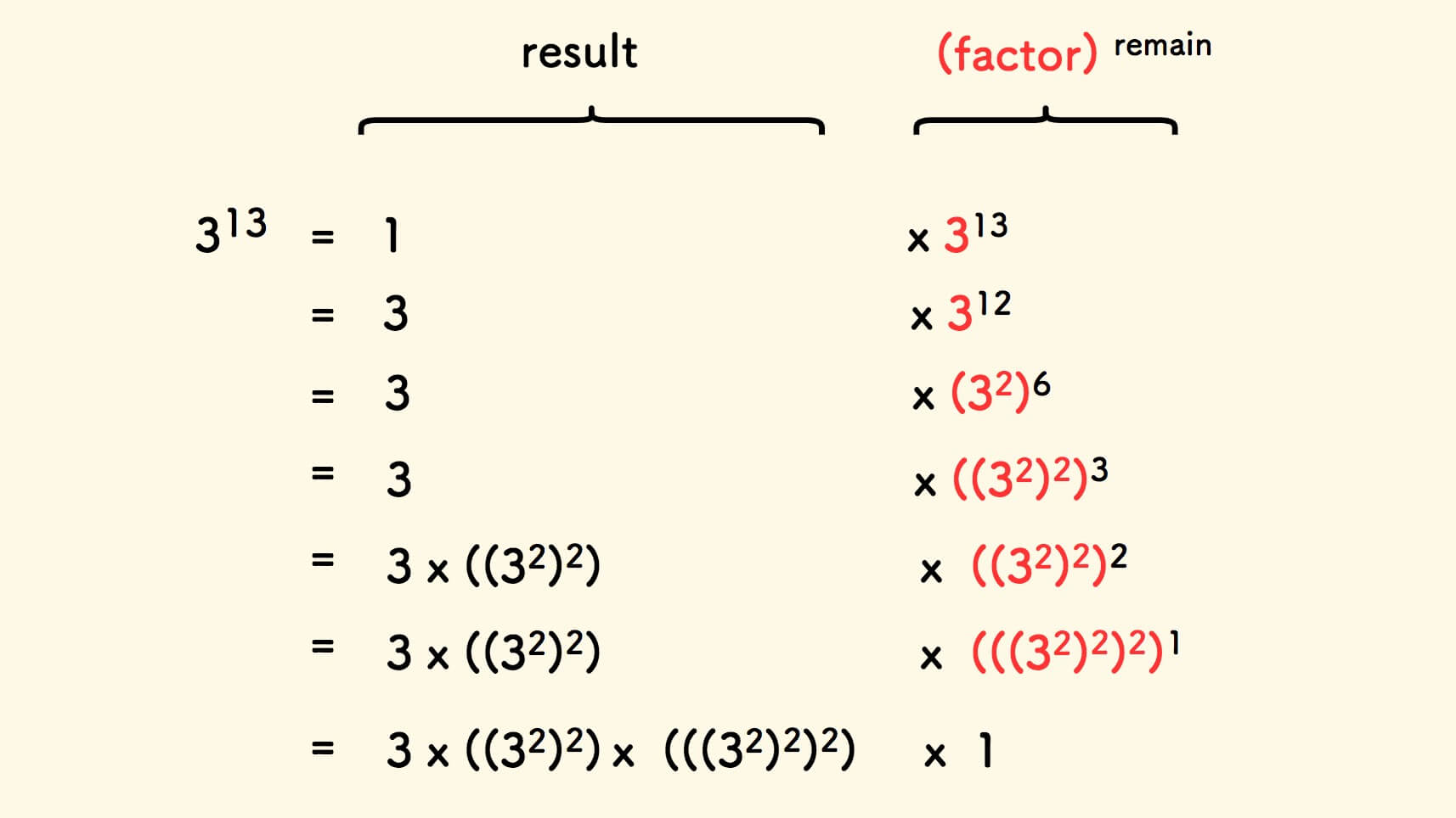 和 乘法 的拆解思路如出一辙, 把 a^b 写成 result * (factor) ^ remain 的形式: