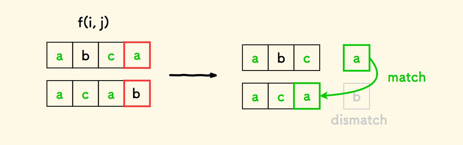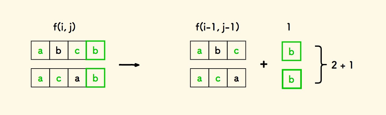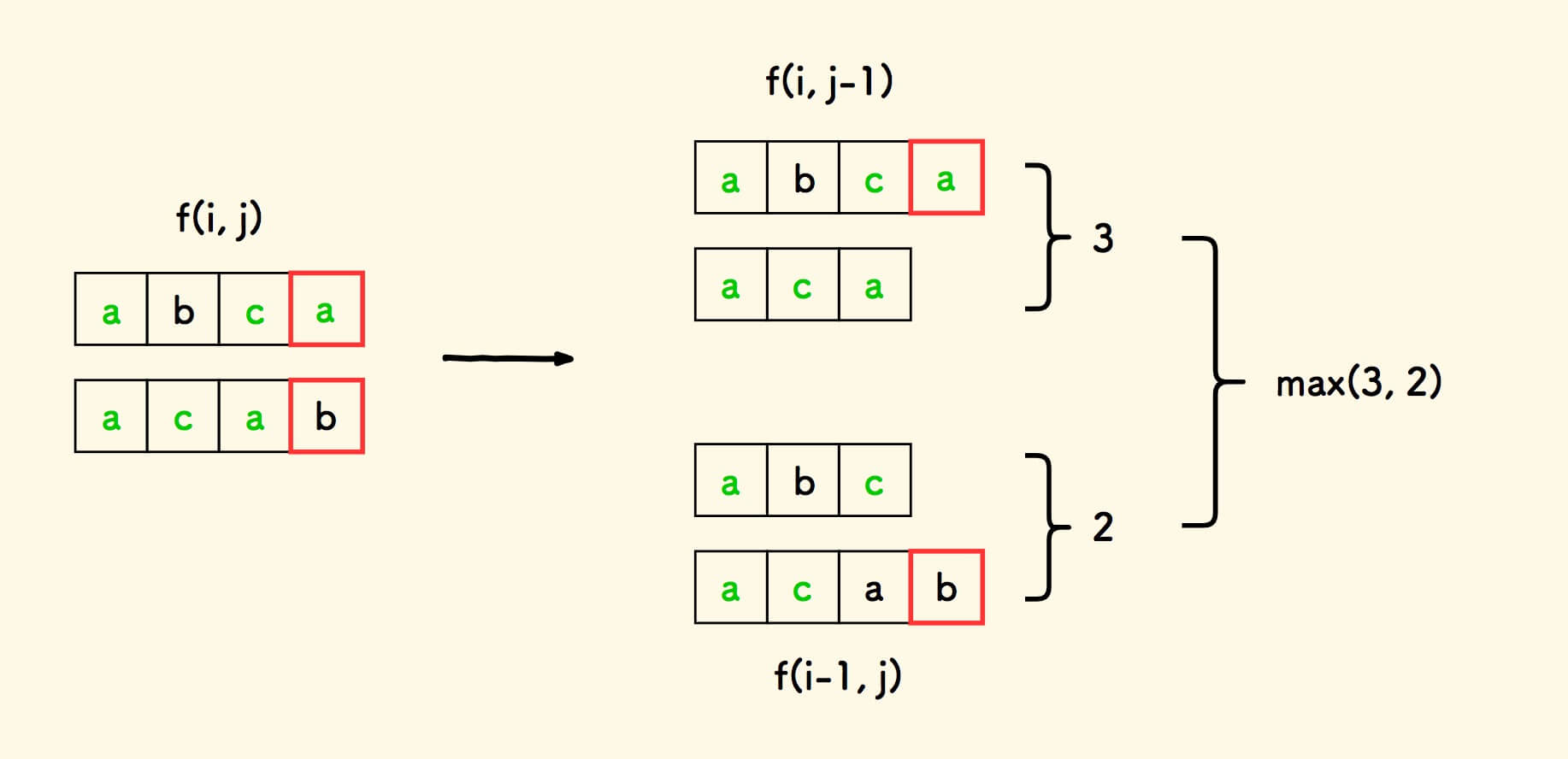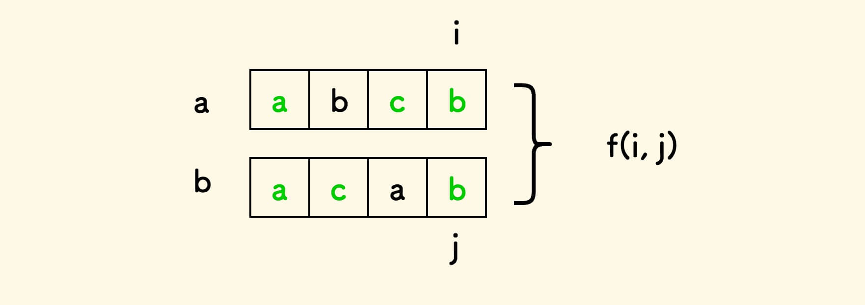 如果两个字符串的尾巴位置分别是 i 和 j , 假设它们的最长公共子序列的长度是函数 f(i, j) :