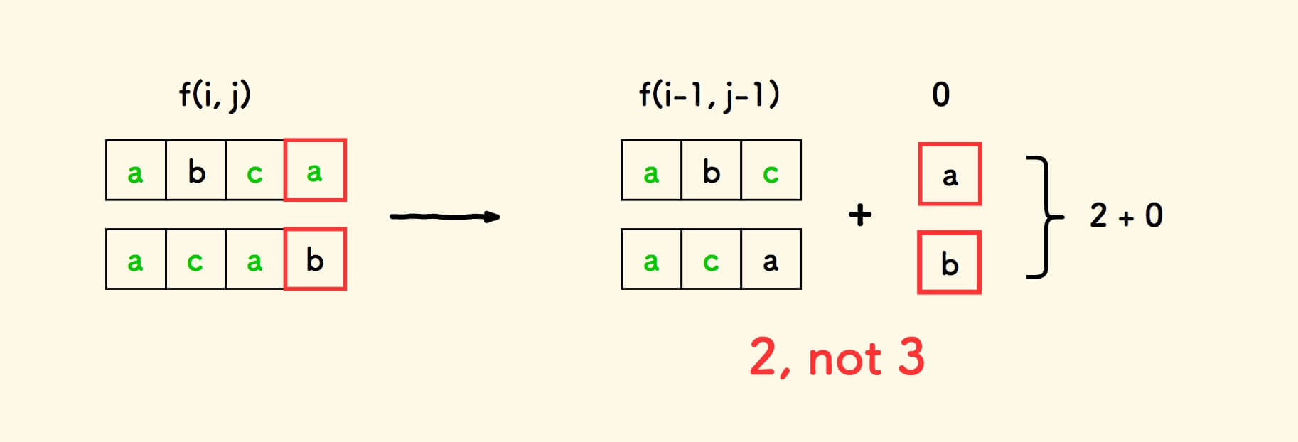 原因在于,虽然尾巴字符不同, 但一个字符串的尾巴字符可能和另一字符串的前面的某个字符相同,导致最长公共子序列得到扩展。