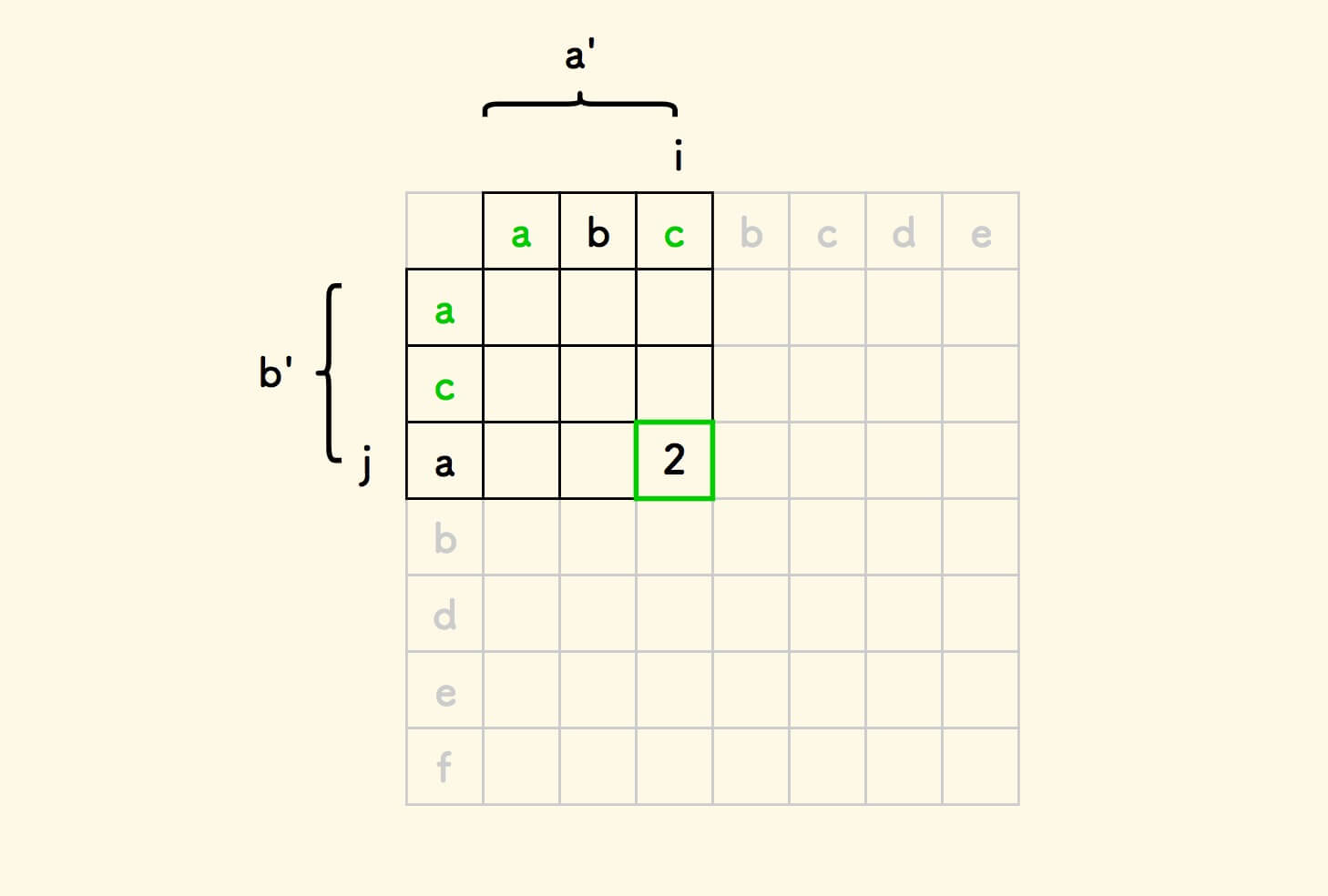 表格位置 i,j 上的数字含义是 f(i,j) ,即 字符串 a' 和 b' 的最长公共子序列的长度 。