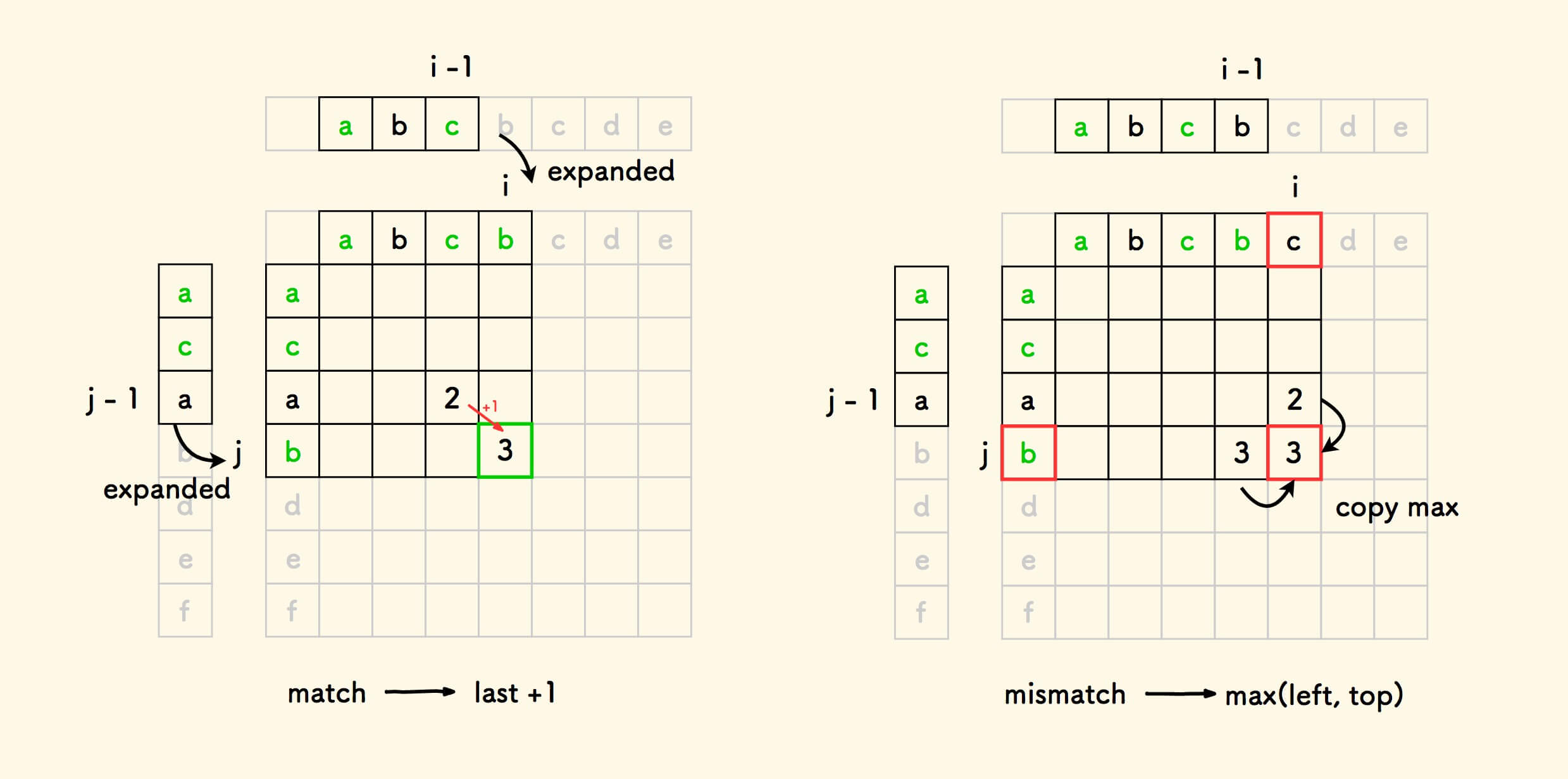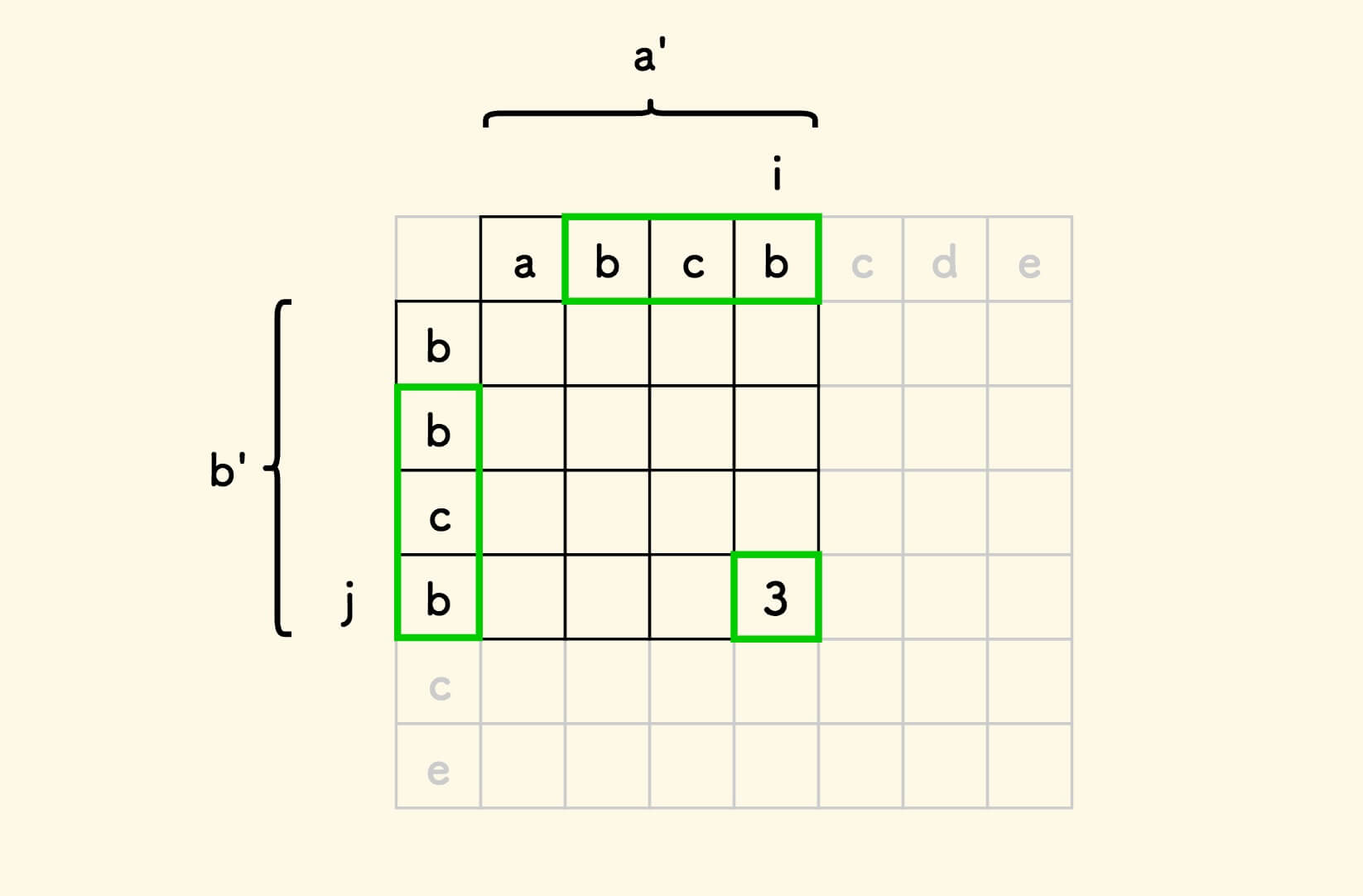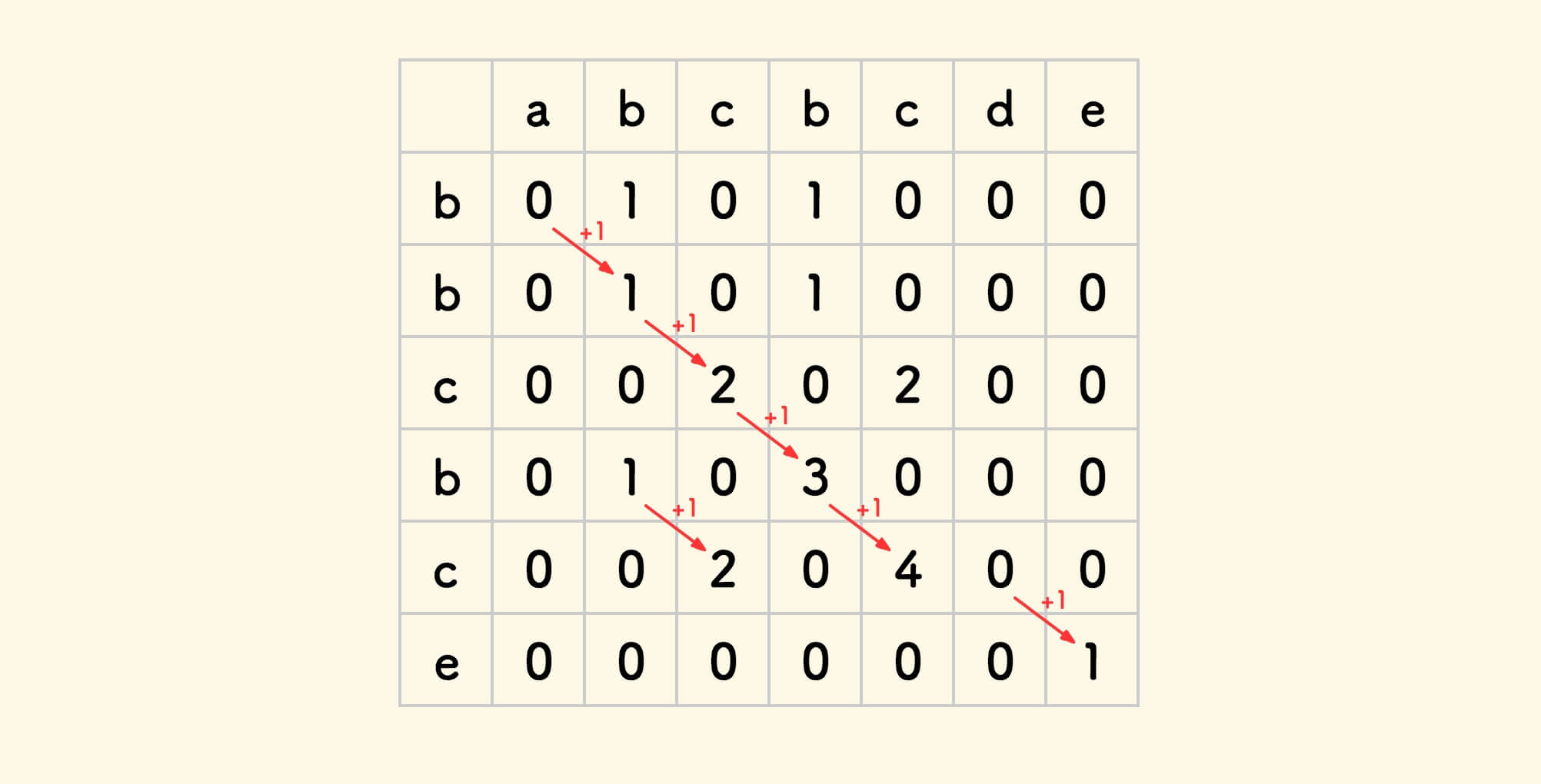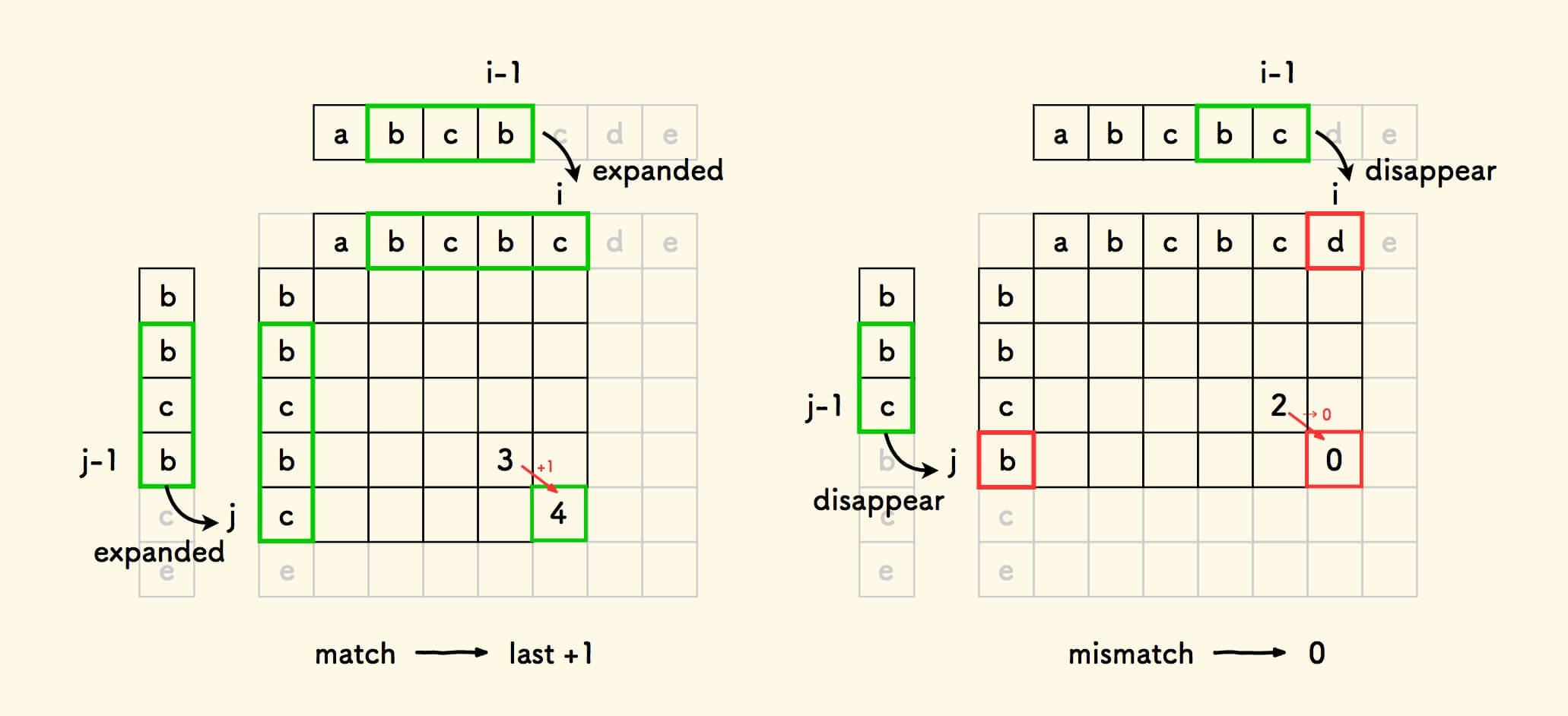 a[i]和b[j]相等,则最长公共子串得到扩展,因此,数值加一。 - 否则,以两个字符为尾巴的最长公共子串不复存在,因此,数值清零。