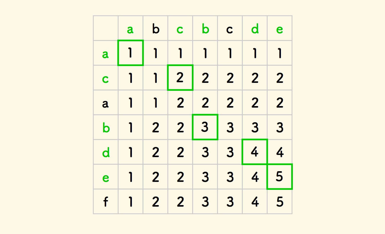 a[i]和b[j]相同,则最长公共子序列得到扩展,数值加一。 - 否则,采用左边的和上面的方格中的数值的最大值。