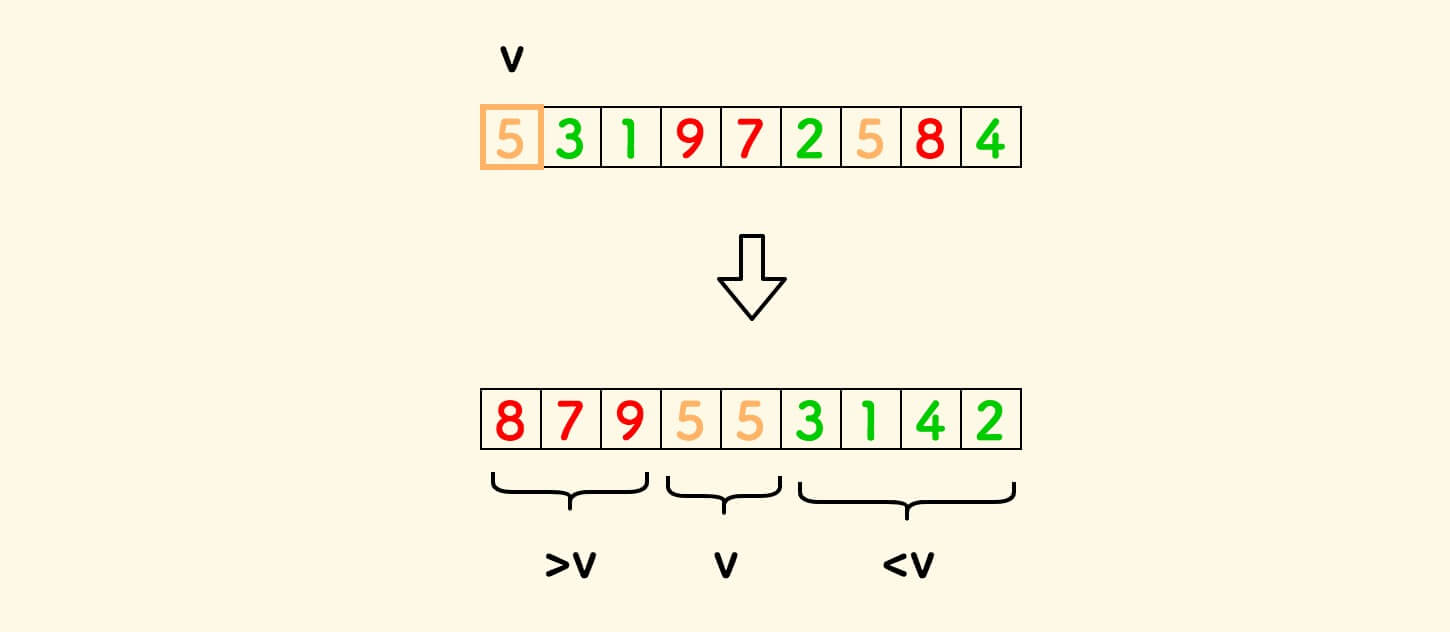 以数组 [5,3,1,9,7,2,5,8,4] 为例, 比如选择第一个元素为基准元素。
