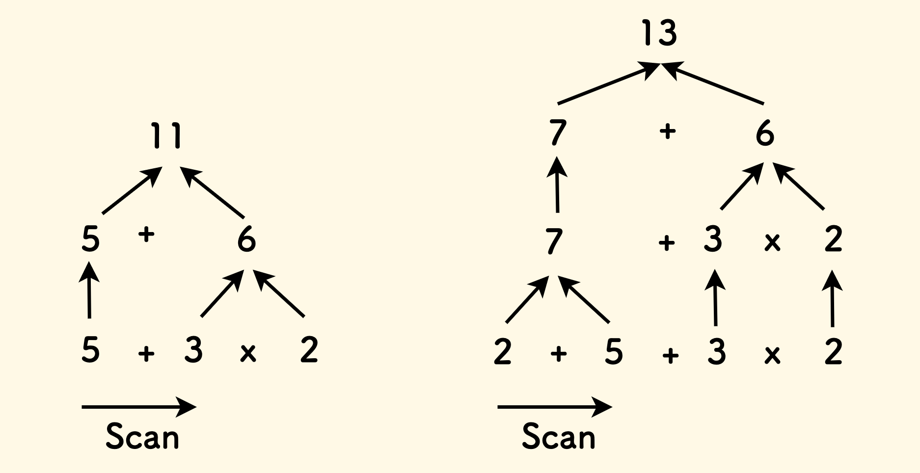 但对于另一个表达式例子 2+5+3x2 来说,我们可以先计算前面的加法。