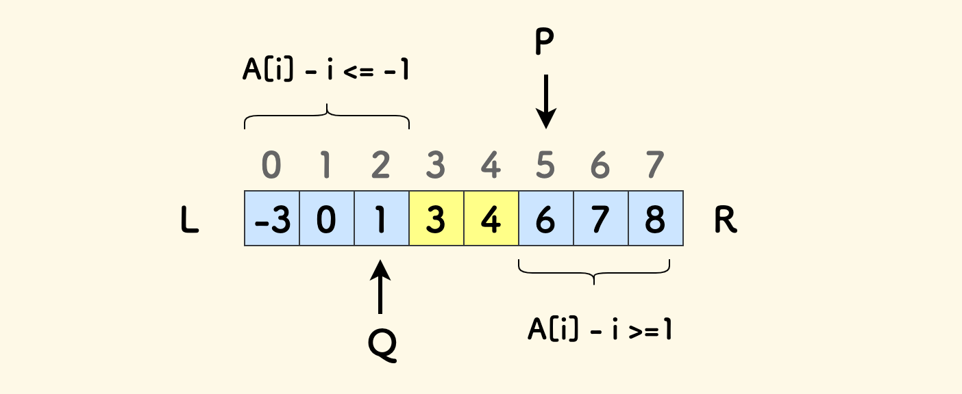 给定一个有序整数数组 A,其中元素各不相同,要求确认是否在其中存在一个索引 i 可以使得 A[i] = i 。