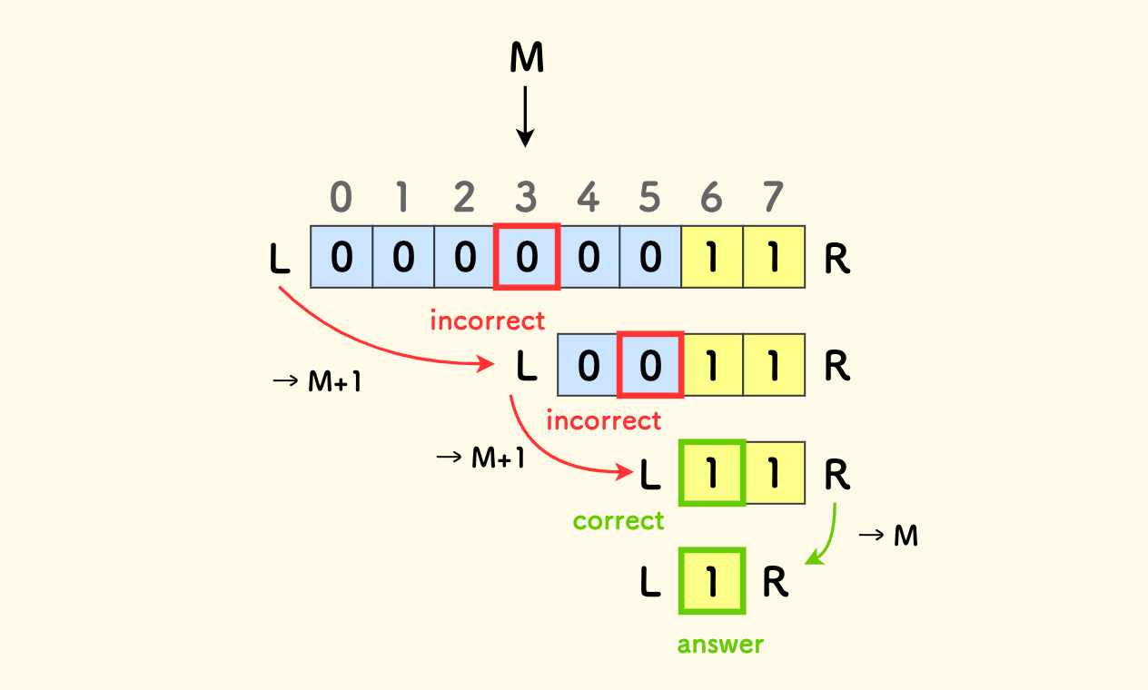 M处的元素,其中M = (L+R)>>1向下取整。 - 如果测试不正确,则收缩左界: