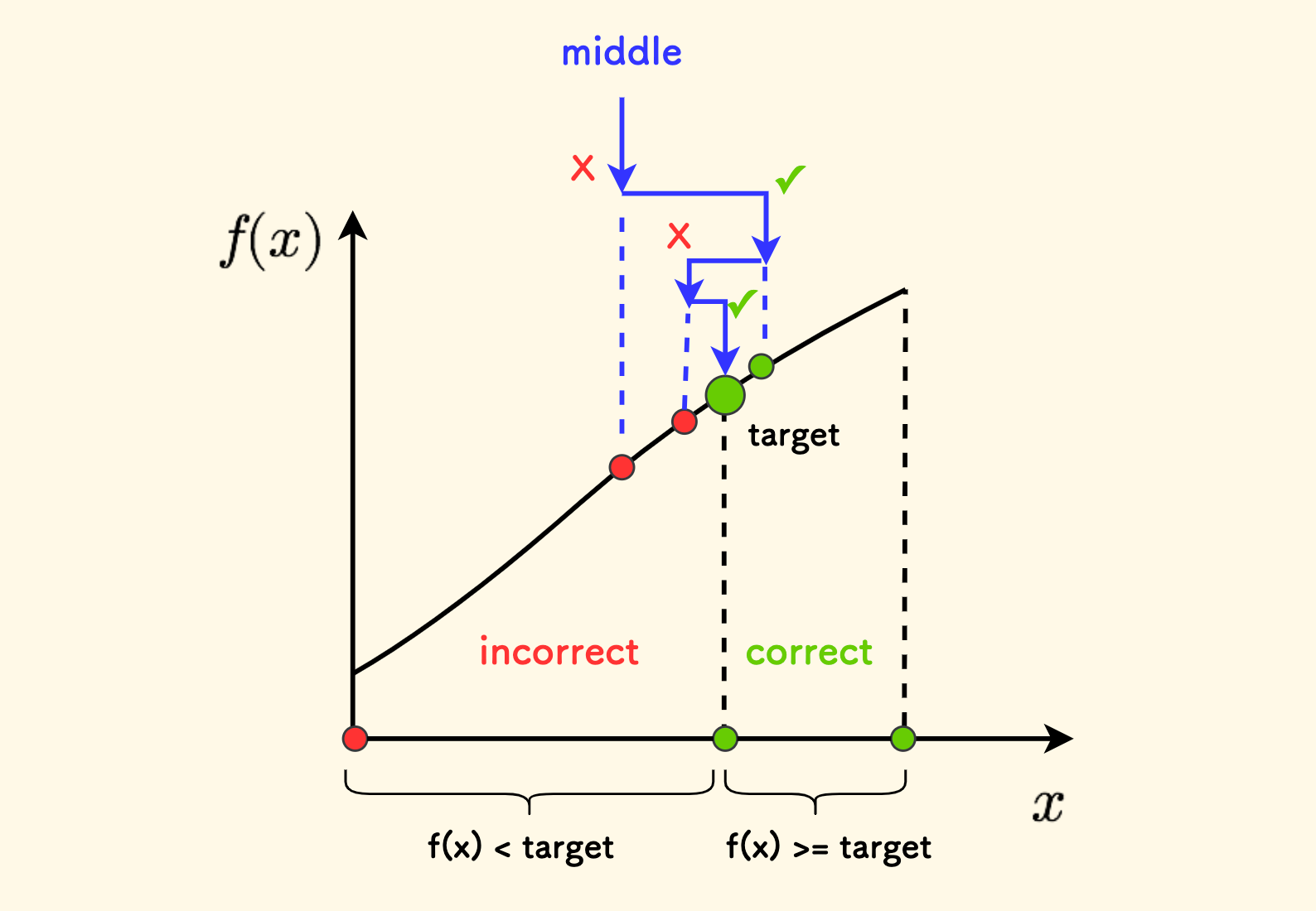 f(x) >= target的可行解的左界,即target或其后继:二分中点向下取整,将区间划分为