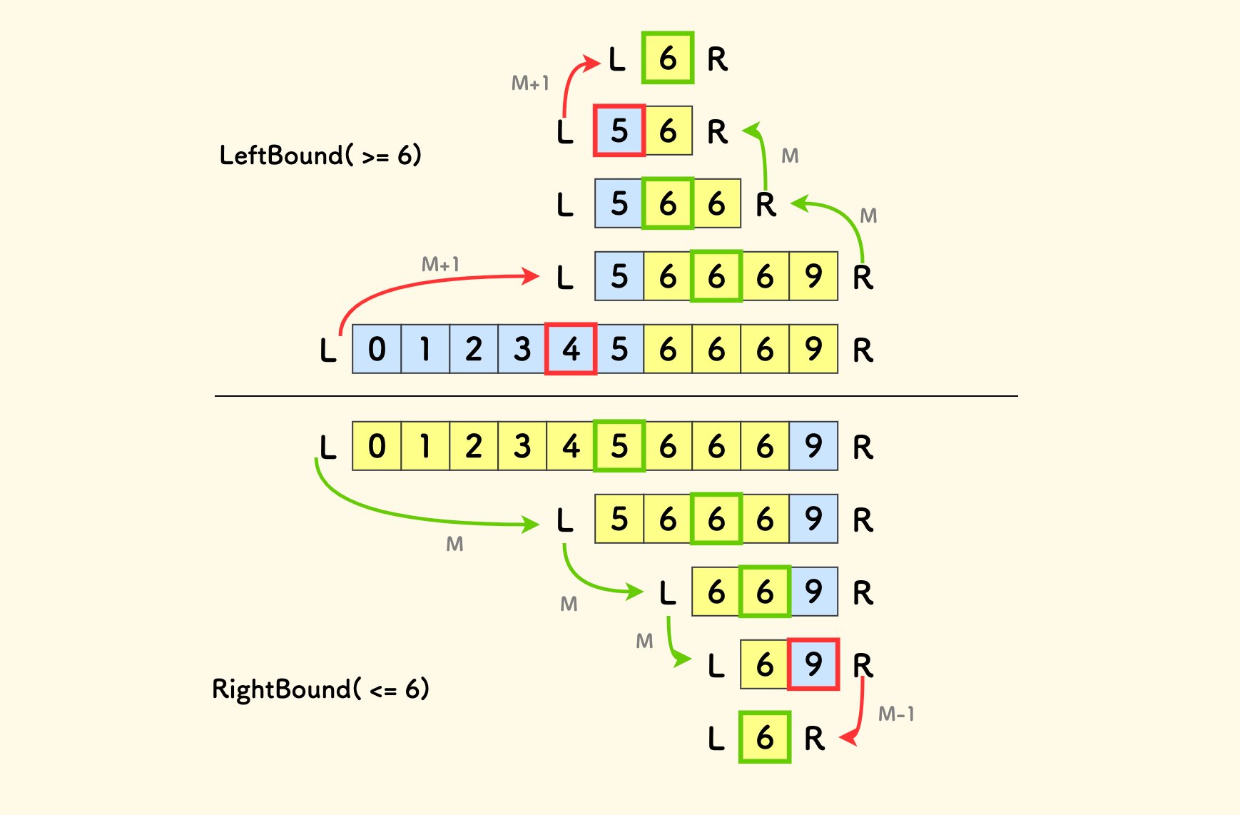 下面的图示中,上方的是找左界的过程、下方的是找右界的过程。其中,绿色表示测试正确、红色表示测试错误。 可行区间不断缩小,直到 L 和 R 相遇。