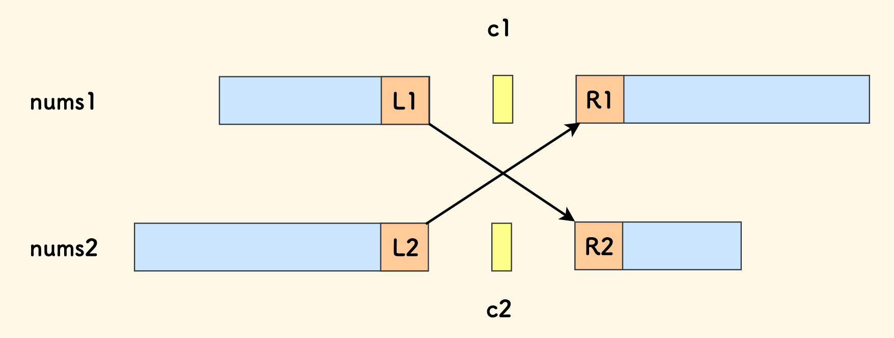 k=(m+n+1)/2个元素。 - 总数偶数的情况下,先求第