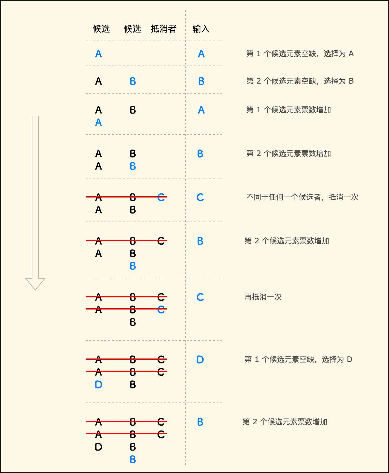 假设数组是 [A, B, A, B, C, B, C, D, B], 下面模拟整个投票过程, 左边的三列分别是两个候选者和抵消者,右边是当前轮次的输入。