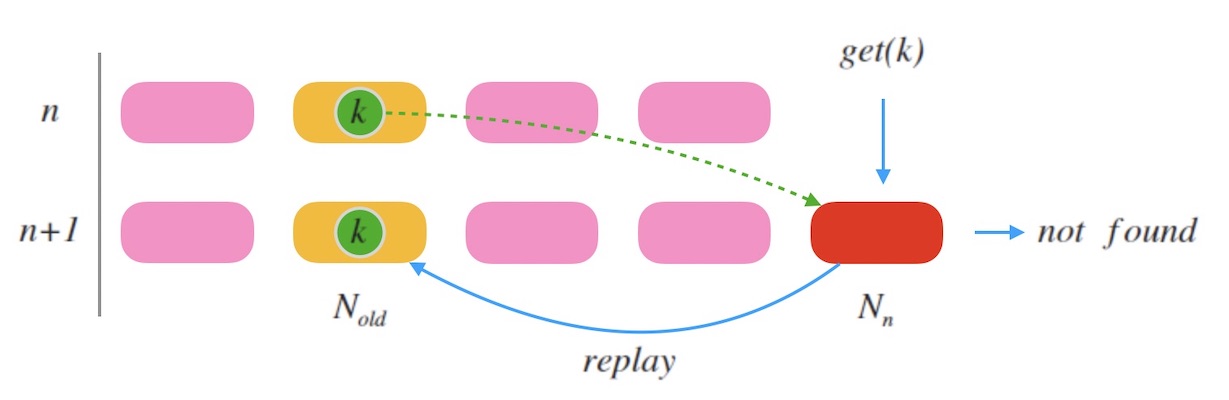 下图10.1是一个示例, 当新加一个节点 $N_n$ 时, $k$ 被映射到新的槽位。 老节点标号是 $N_{old} = ch(k, n)$。 当一个查询 $get(k)$ 到来, 因为 $k$ 此时映射到的是新节点 $N_n$ , 所以可能会查不到数据, 接下来把请求中继到老节点 $N_{old}$ , 即可以查到结果。 同时 $N_n$ 把 $k$ 对齐到自己这里。