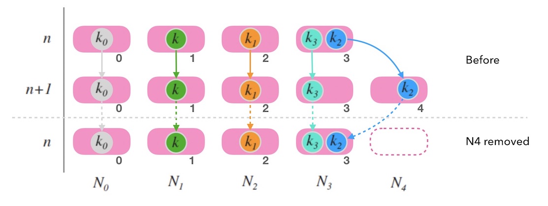 假如移除最后一个节点, 如下图10.2中, 尾部节点 $N_4$ 被移除后, 整体映射情况和节点数为 $n$ 的时候是一致的。 一切看上去还好。 只要考虑如何备份 $N_4$ 上的数据就可以了。 参考上面如何扩容的玩法,可以把尾部节点的数据备份到老节点 (例如,图10.2中 $k_2$ 的老节点就是 $N_3$)。