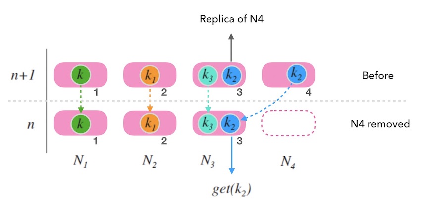 下图10.4中, 删除了 $N_4$ 后, $k_2$ 被重新映射到 $N_3$, 因为 $N_4$ 的数据在 $N_3$ 有备份, 因此正常。