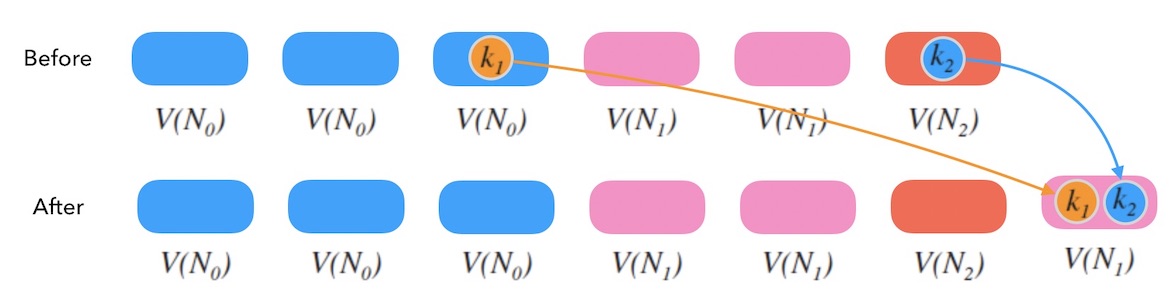 下图10.5中, 删除了 $N_1$ 后, 由于 $k$, $k_1$, $k_3$ 都在邻居节点上有备份, 所以此时映射右偏后并不会造成三个数据丢失, 而且查询也是正确的。