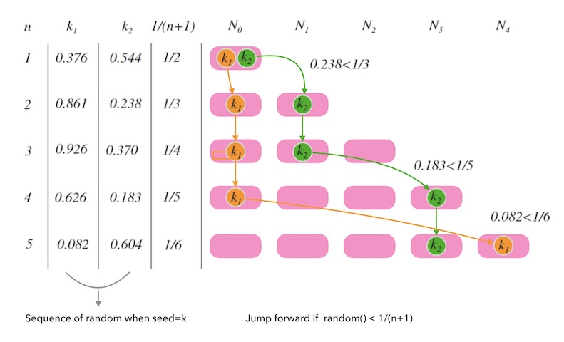 不难得知, $random.next() < 1/(j+1)$ 发生的概率是相对小的。 所以我们的判断条件命中率并不高, 只有少数的 $k$ 选择跳, 这正是优化点, 现在的 $j$ 是一步一步跑的, 那么接下来我们让 $j$ 跳着跑。