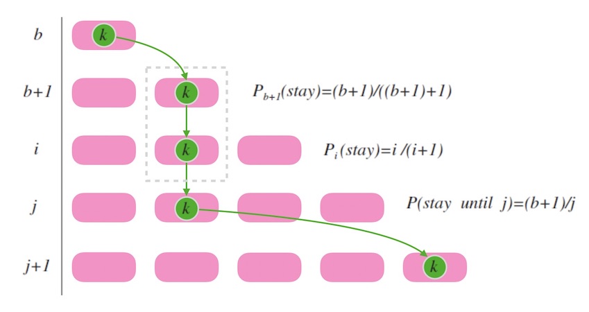 上面的 $ch$ 函数中, $b$ 是用来记录 $k$ 最后一次跳入的槽位标号。 假如我们现在处在 $k$ 刚刚跳入最后一个槽位的时刻, 此时一定有 $(b+1)$ 个槽位。 接下来的时刻, 我们要再新增一个槽位变为 $b+2$ 个时, 易知 $k$ 不换槽位的概率是 $(b+1) / (b+2)$。 假设我们要找的下一个 $b$ 是 $j$, 就是说,假设当槽位数目到了 $j+1$ 个时 $k$ 跳入最新槽位, 那么, 在此期间, $k$ 保持连续不换槽位的概率是(注意计算的终止项):