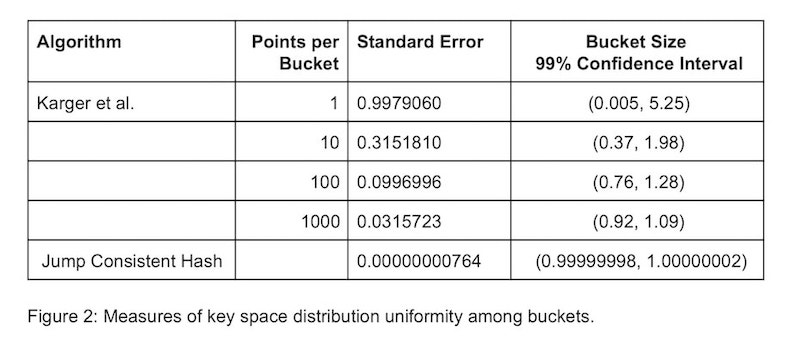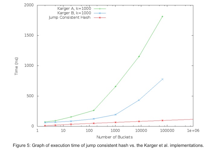 It is interesting to note that jump consistent hash makes fewer expected jumps (by a constant factor) than the log2(n) comparisons needed by a binary search among n sorted keys.