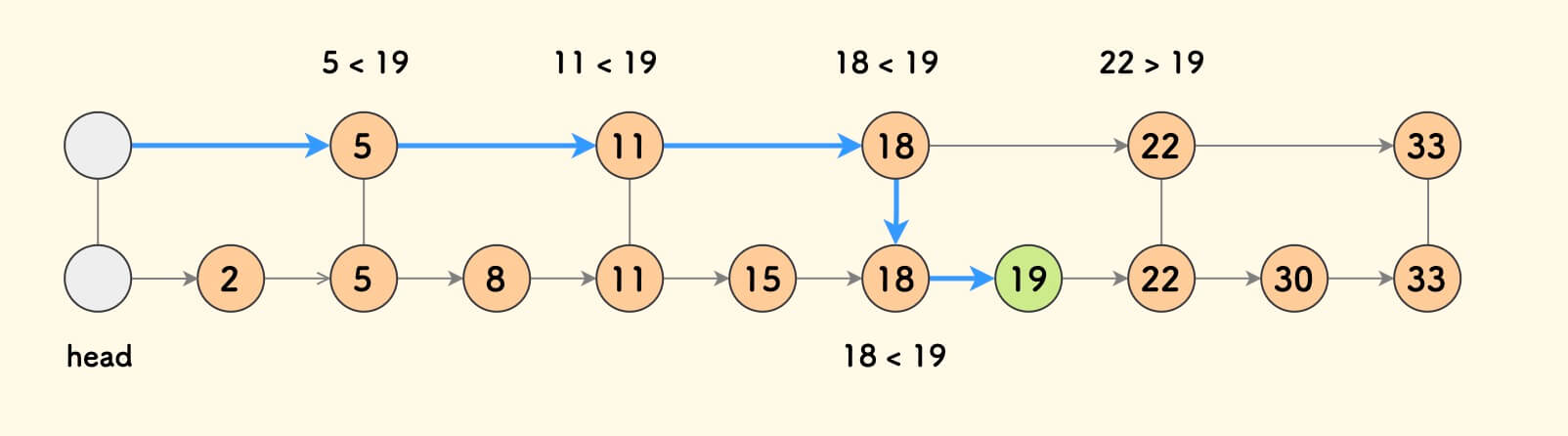 对一个单链表,做一些冗余,每隔一个节点,搭一条线,指向下下个节点。 另外,给单链表加一个虚拟头节点,它不存储具体数据,只充当链表头。