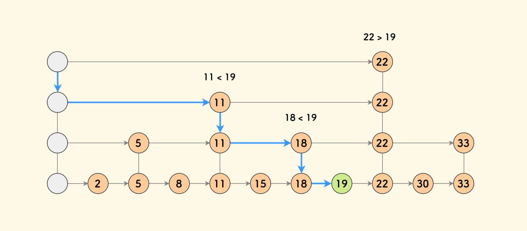 从跳跃表的左上角节点,向右考察,直到遇到一个不比目标值小的节点,则向下一层继续,直到最底层。 判断最底层当前节点的下一个节点是否是目标值即可。