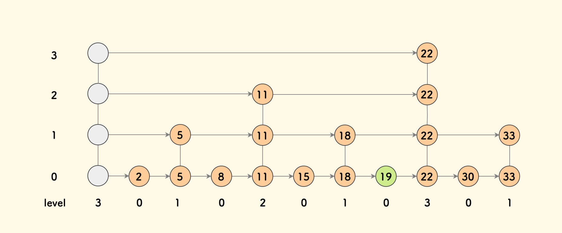 head是一个虚拟头节点,不存储数据;并且它的阶始终和最高阶节点对齐。 - 每个节点都有一个前进数组