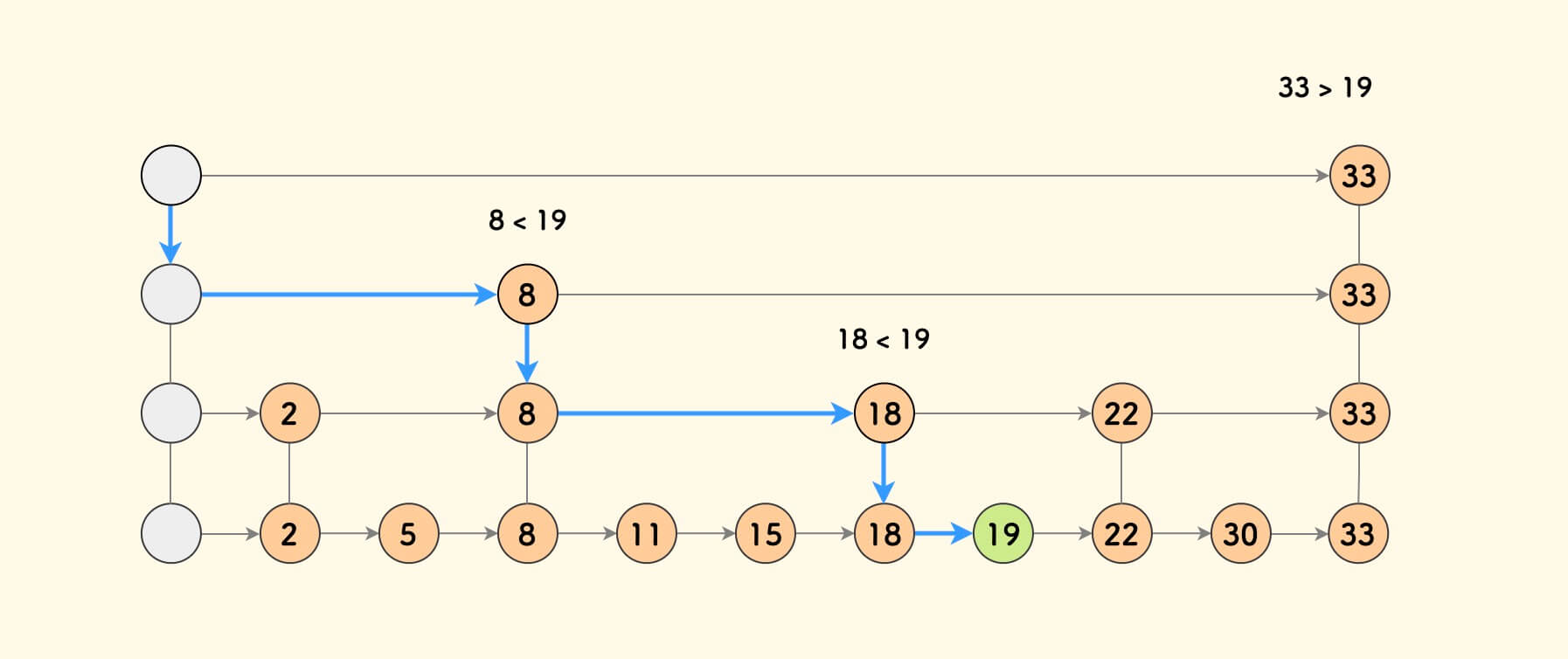 下图是一个示例,它并不严格地符合 “间隔搭线” 的规则。如之前那样, 上层仍然给下层提供了快速通道,加速了查找过程。