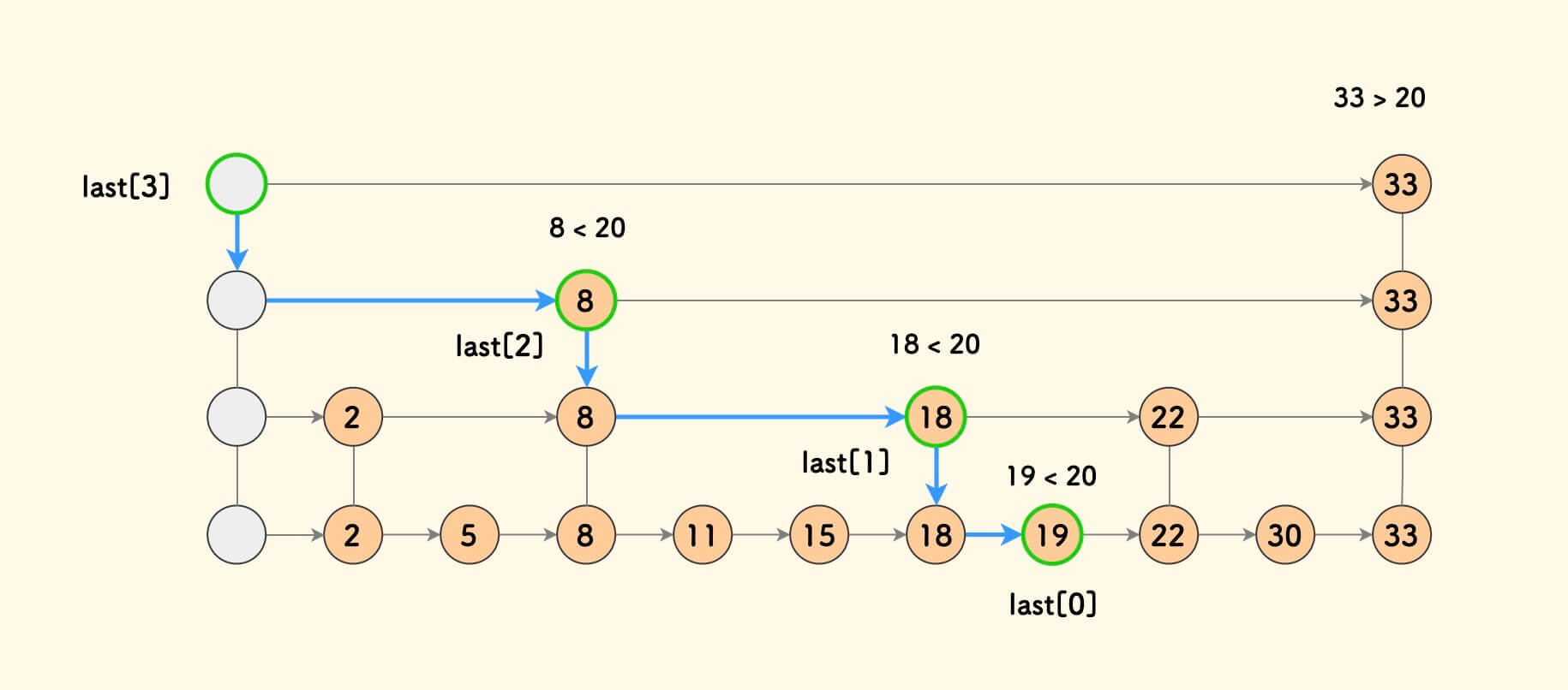 20,其中数组last[k]表示找到的第k阶上的前驱节点。找的方法和查找过程一样,只需要记住每一层可以向右考察到的最后一个节点即可。