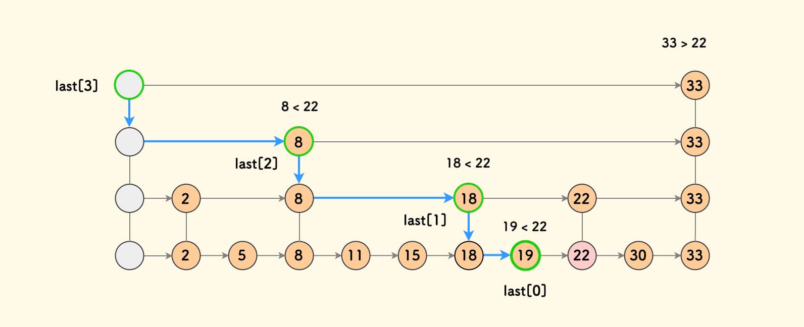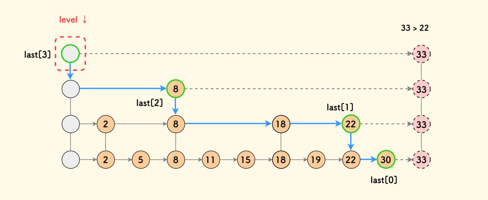 图 3.1 - 找到各层的插入位置 last[k] 决定新节点的阶 。