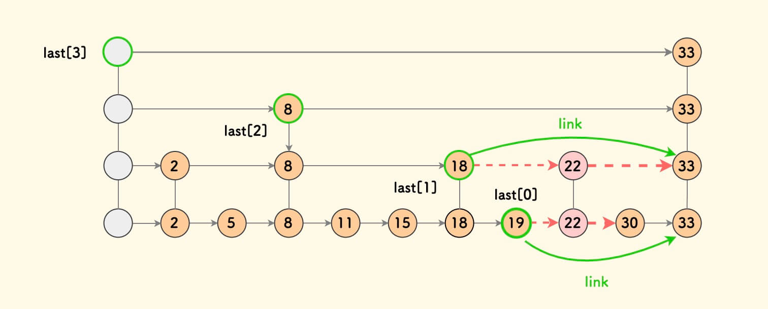 22为例,具体的删除动作就是,如果last[k]的后驱是22, 则将last[k]的后驱指向22的后驱。