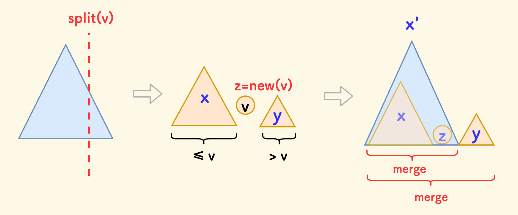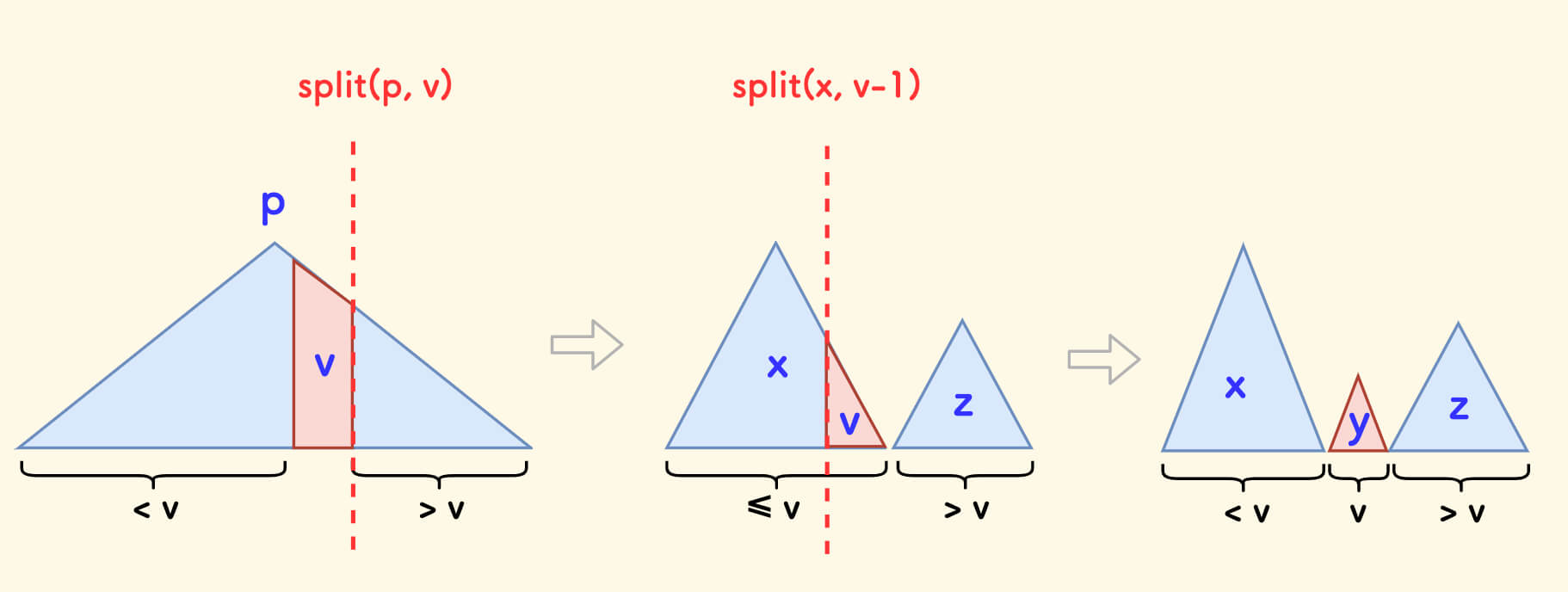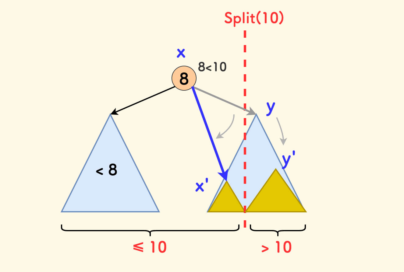 p按值v分裂成两颗子树:左边的x和 右边的y。 - 使得分裂后子树