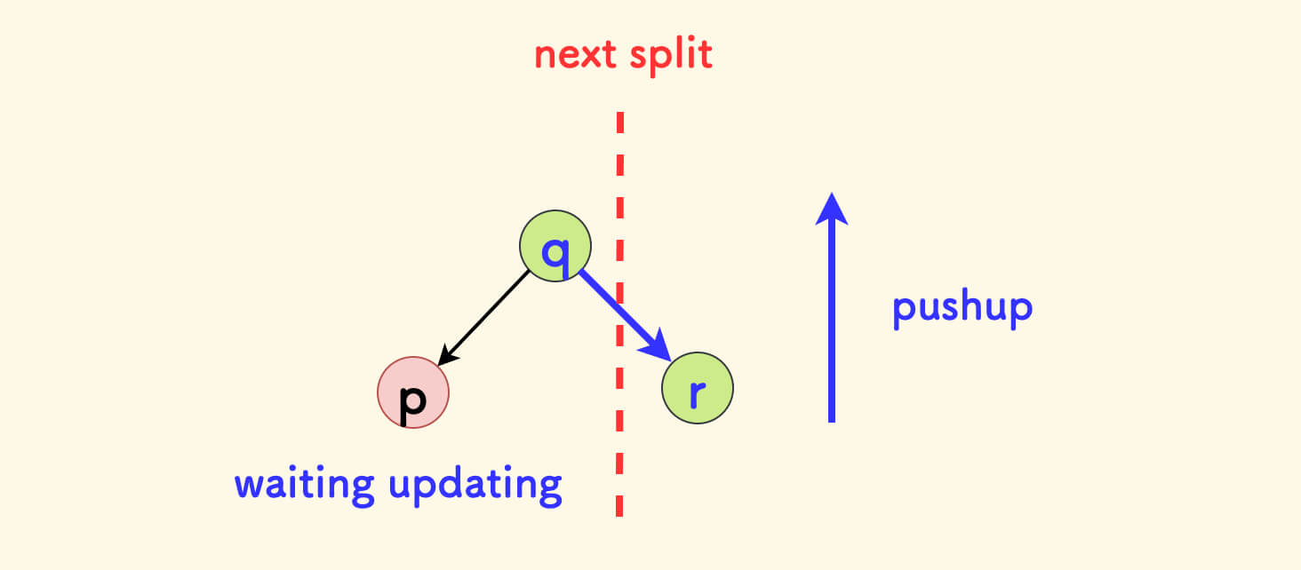 比方说,对节点 p 打了延迟更新的标记,它的父节点是 q,另一个孩子是 r,如果下一次 分裂 或者 合并 只路过了 r,而没有路过 p, 延迟更新就不会触发,pushup 函数对 q 节点的求和就会算错。