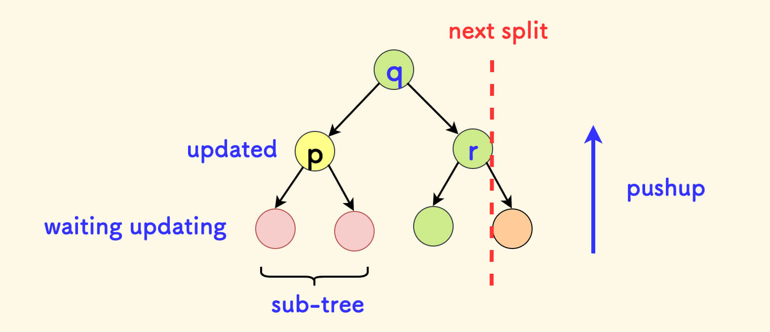 pushup 跟随在递归之后,自底向上进行,在 分裂 和 合并 过程中都会调用。