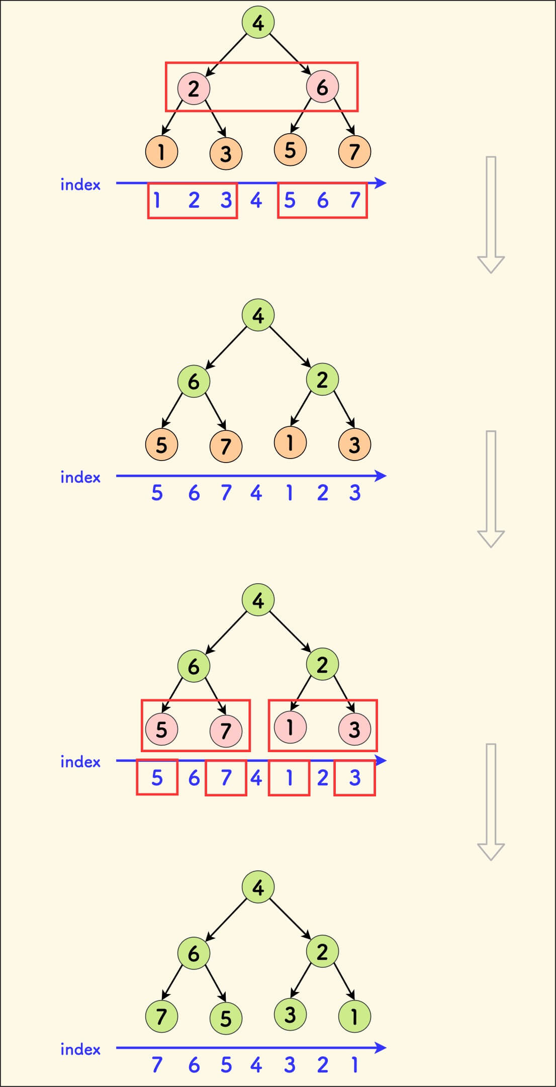 假设已经把目标区间的子树剖分出来,下图演示了这个子树的翻转过程: