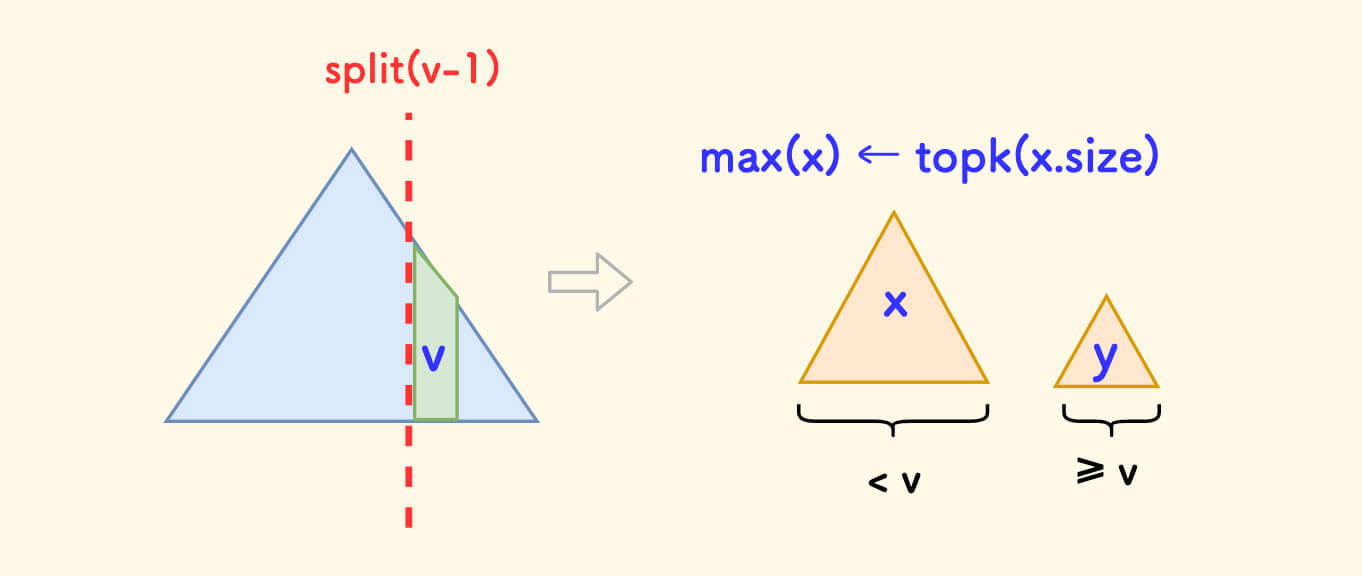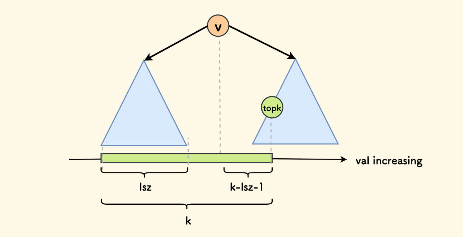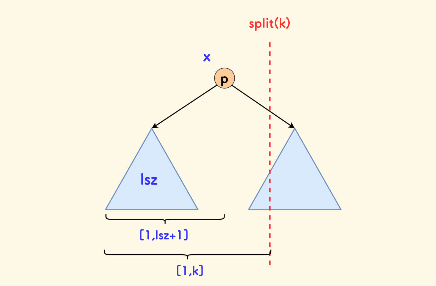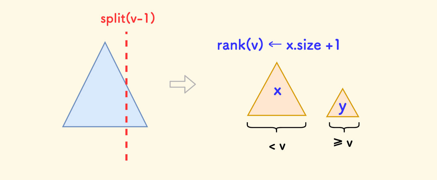 p的左子树中的权值肯定全部小于v,分裂后属于x。此时,x可确定为p。- 只需要继续递归分裂