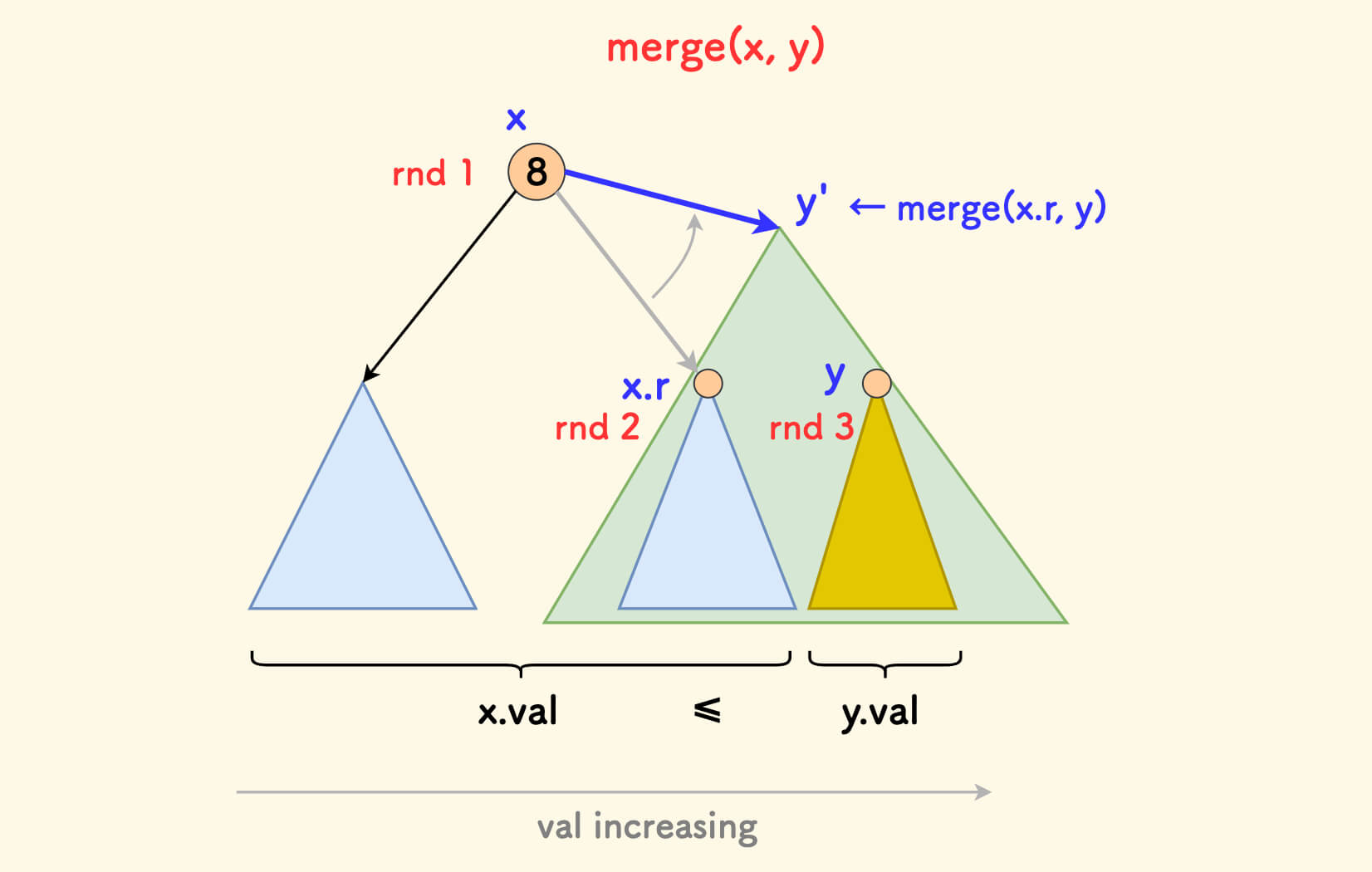 rnd合并两颗 treapx和y,使得合并后成为一颗新的 treap - 入参要求:
