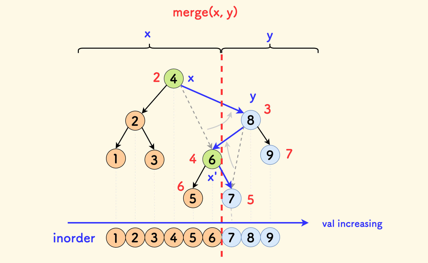 val分裂,递归过程。 - 合并:按随机值