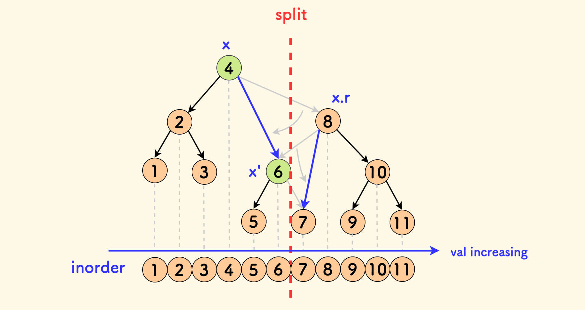 下图中,在分裂后 x 节点指向了 x',但是 x' 一定来自 x 原来的右子树中,所以 x' 在中序遍历中一定仍位于 x 之后。