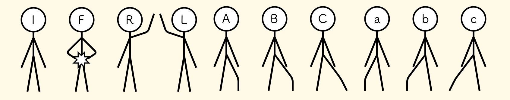 I- 静止状态 IdleF- 开火状态 FireR- 举起右手 Hand right raised.L- 举起左手 Hand left raised.A- 右腿迈一步 Right leg at step 1st.B- 右腿迈两步 Right leg at step 2nd.C- 右腿迈三步 Right leg at step 3rd.a- 左腿迈一步 Left leg at step 1st.b- 左腿迈两步 Left leg at step 2nd.c- 左腿迈三步 Left leg at step 3rd.