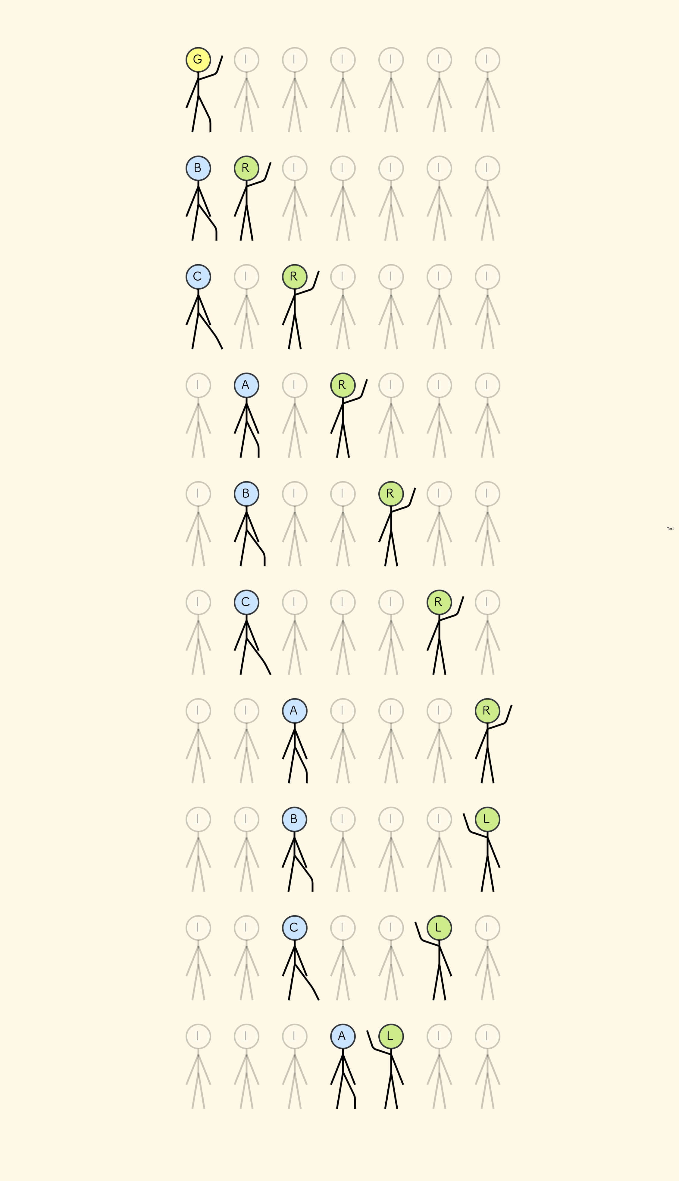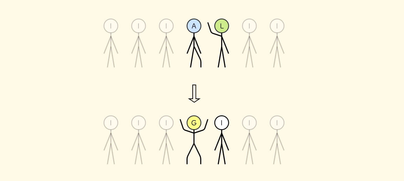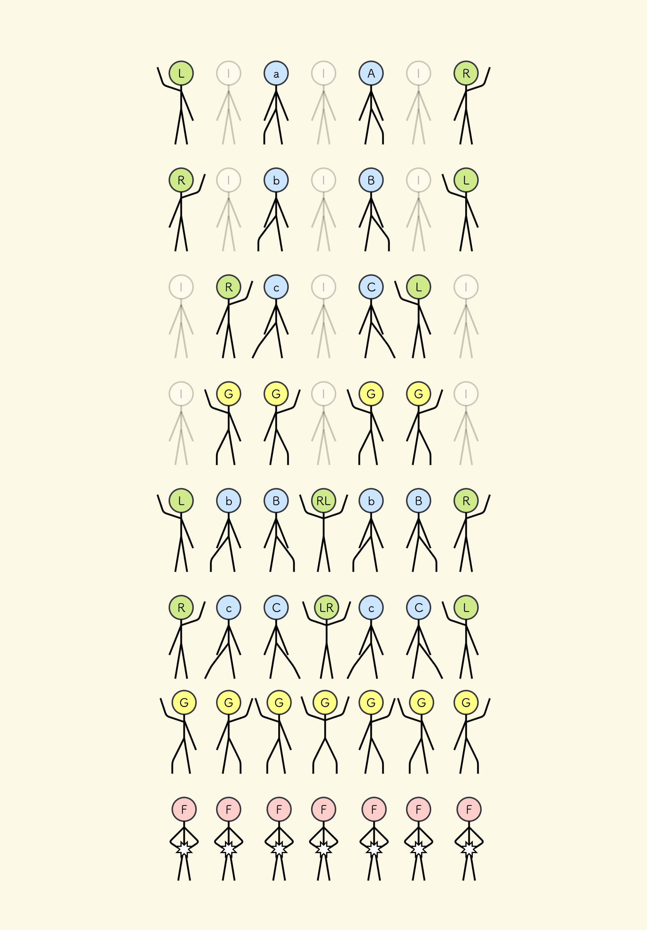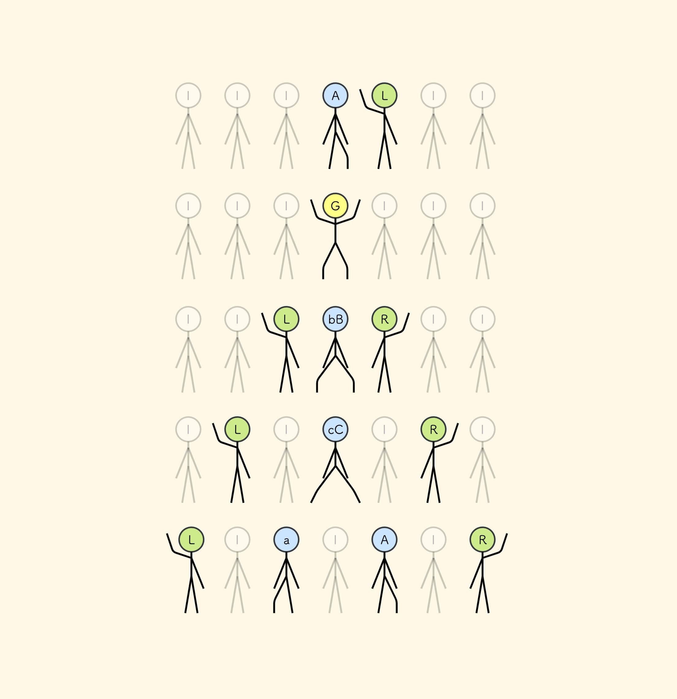A 和 L 相遇,也算是迈腿和举手两种动作传播的碰撞,不同的是这一次只需要 A 变为 G , 这样,才得以使队伍一分为二。
