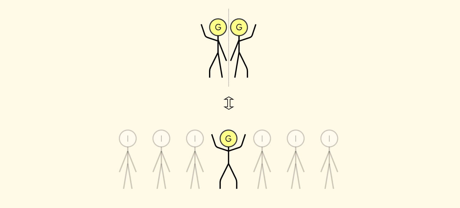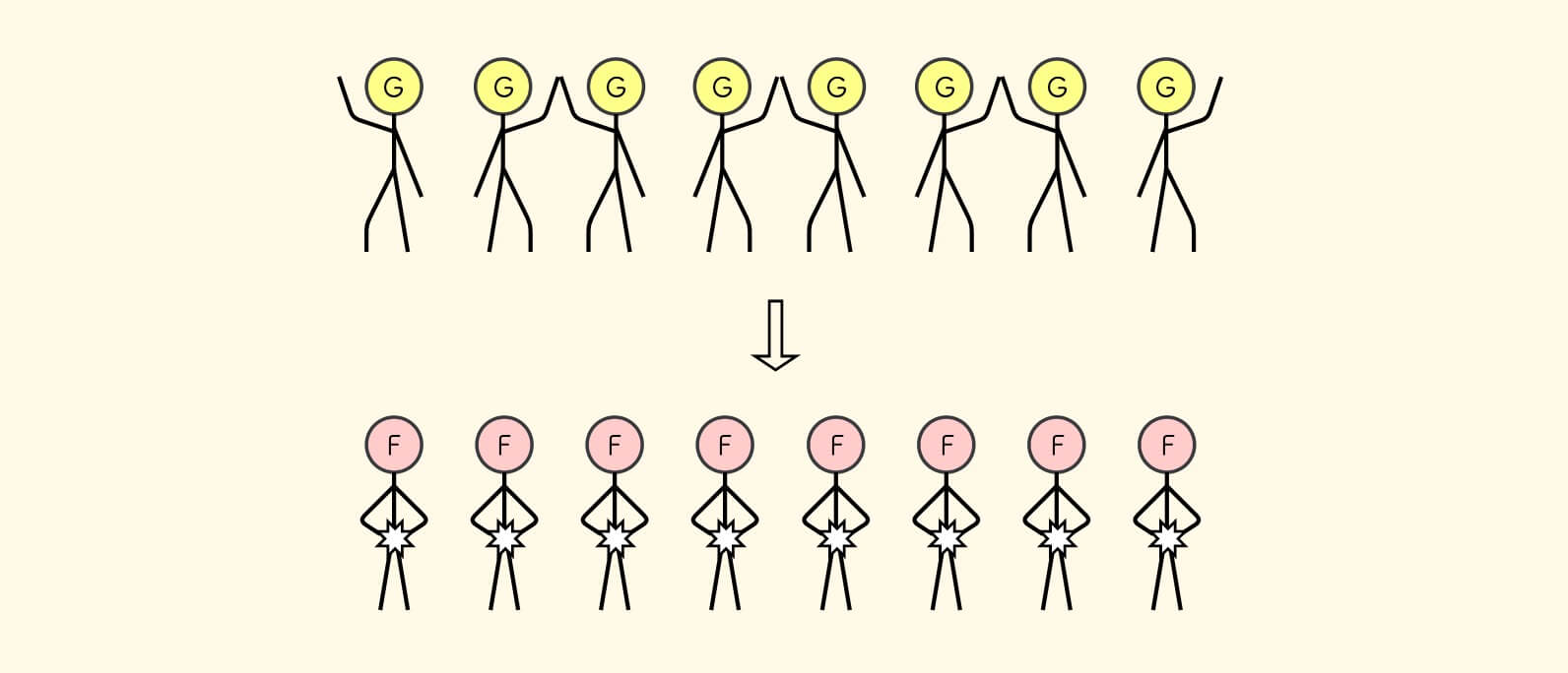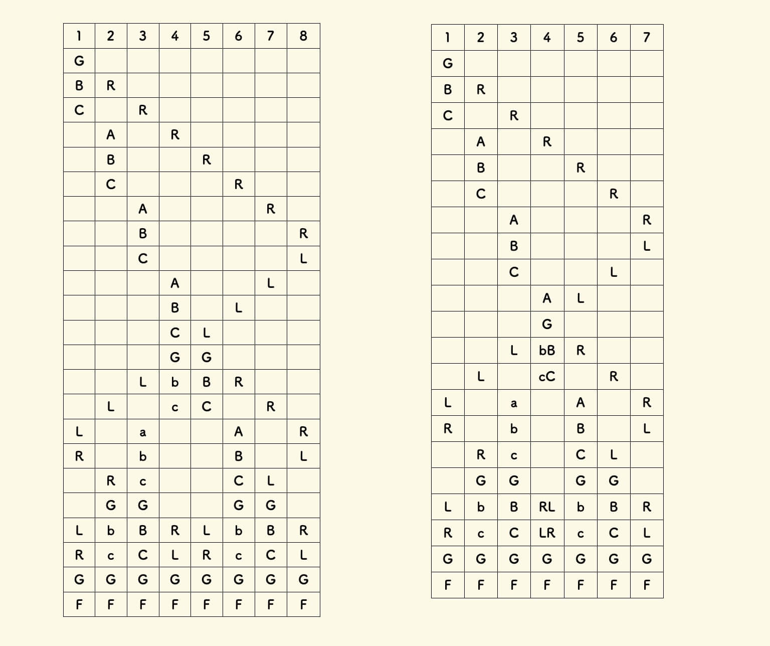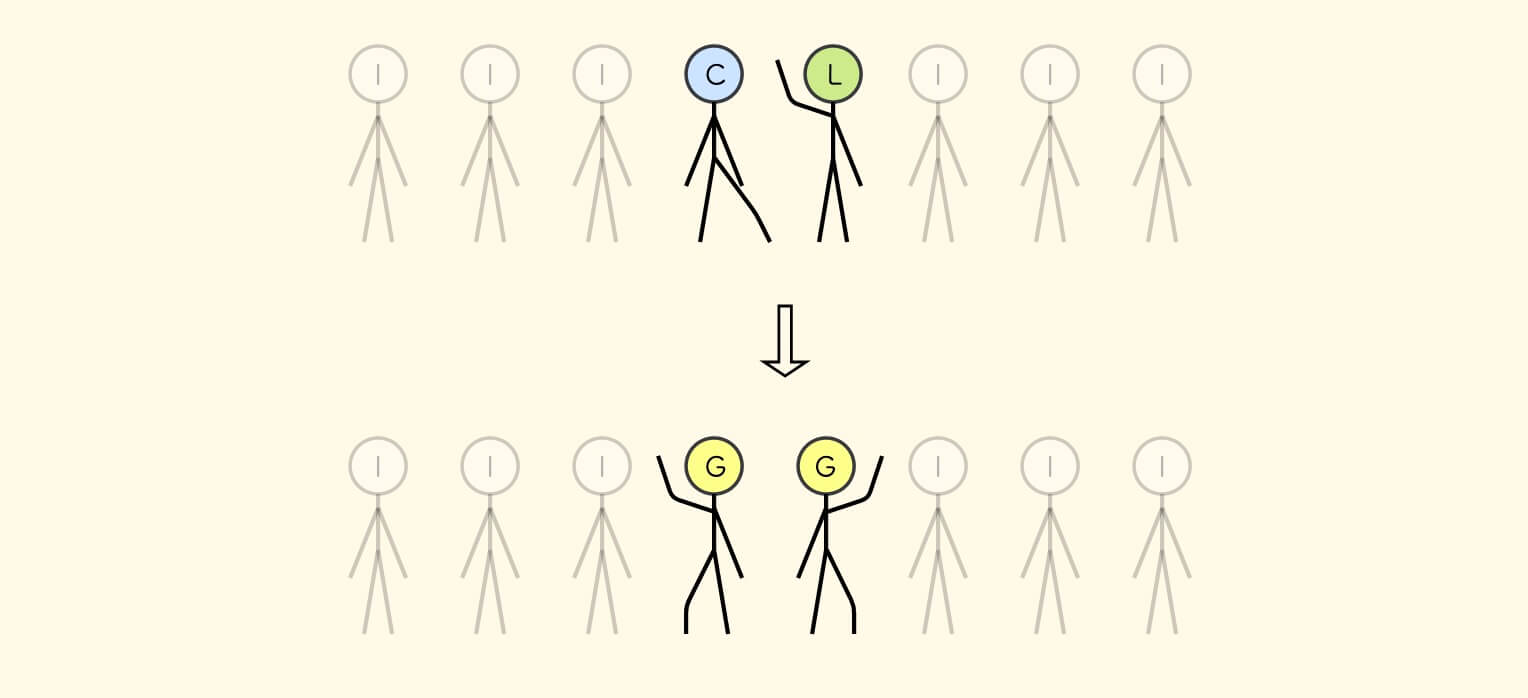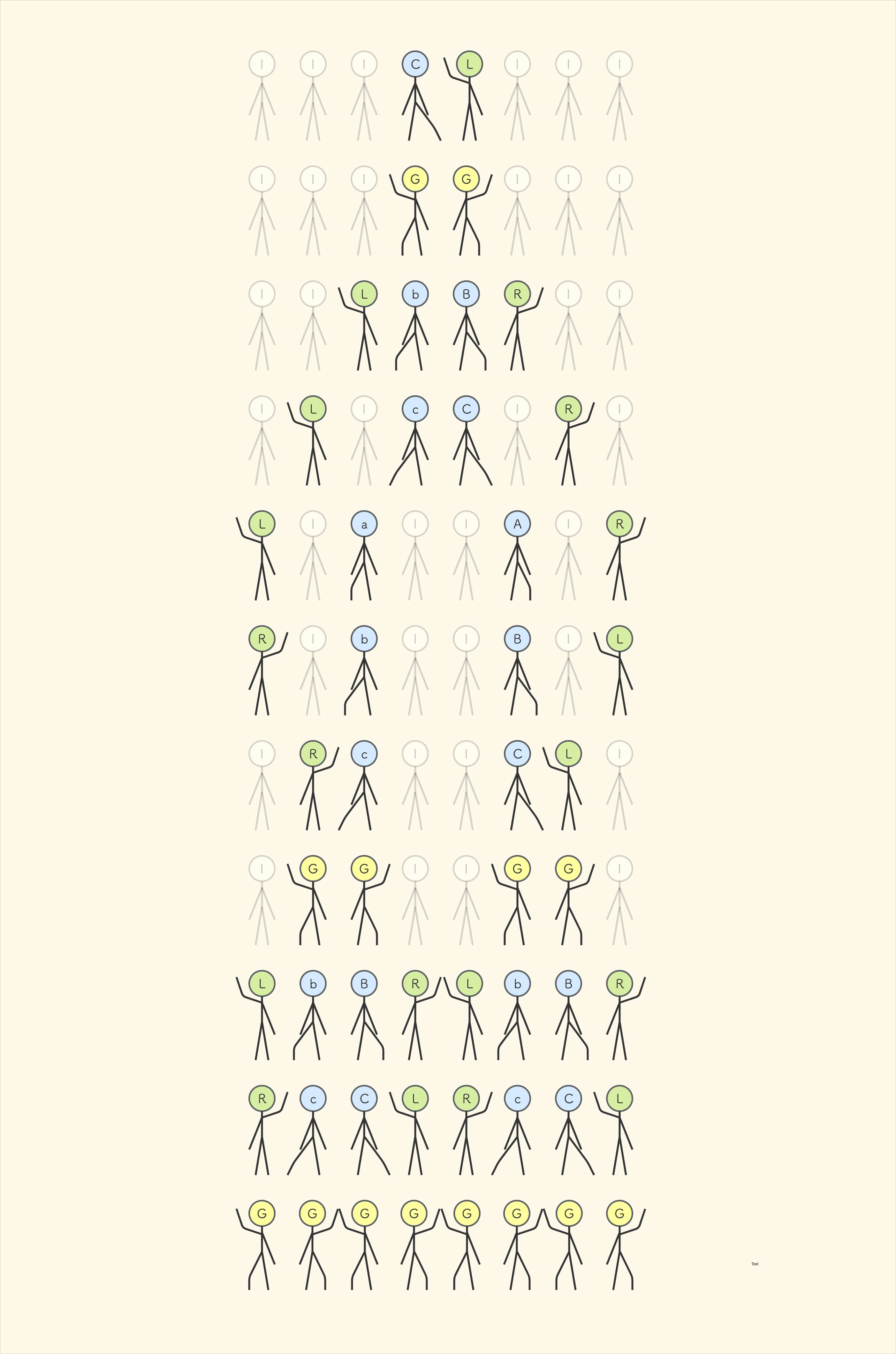 A 和 L 相遇,也算是迈腿和举手两种动作传播的碰撞,不同的是这一次只需要 A 变为 G , 这样,才得以使队伍一分为二。