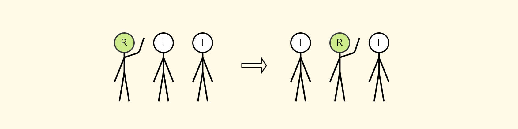 如果一个士兵看到他左边的人在 C 状态,那么他就进入 A 状态。 通俗点说,左边的人迈右腿快结束了,我才开始迈右腿。