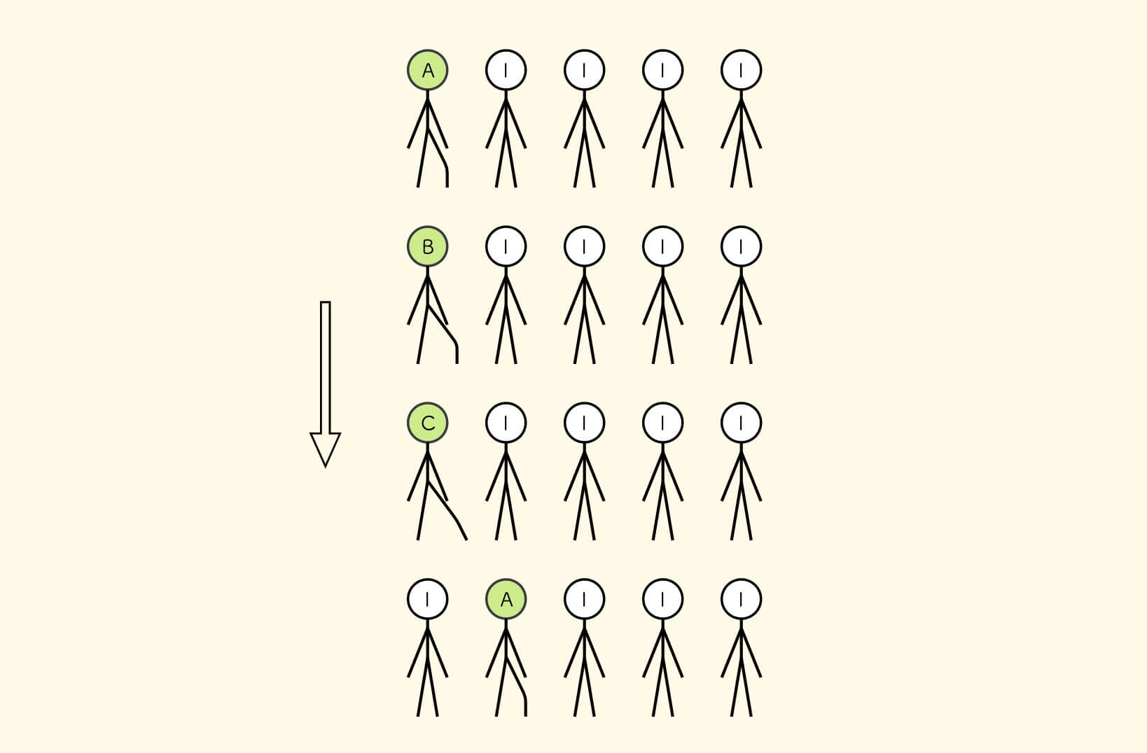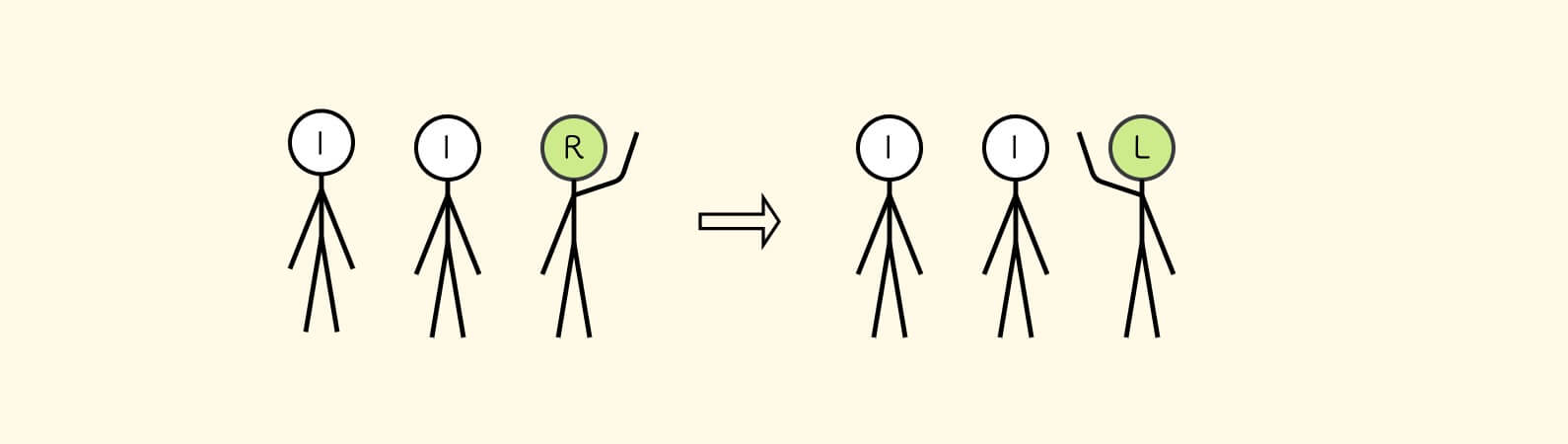 在最开始的阶段,和前面 8 个士兵的情况差不多,不同的是,这一次是 A 和 L 相遇。