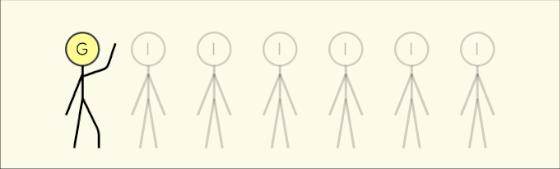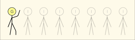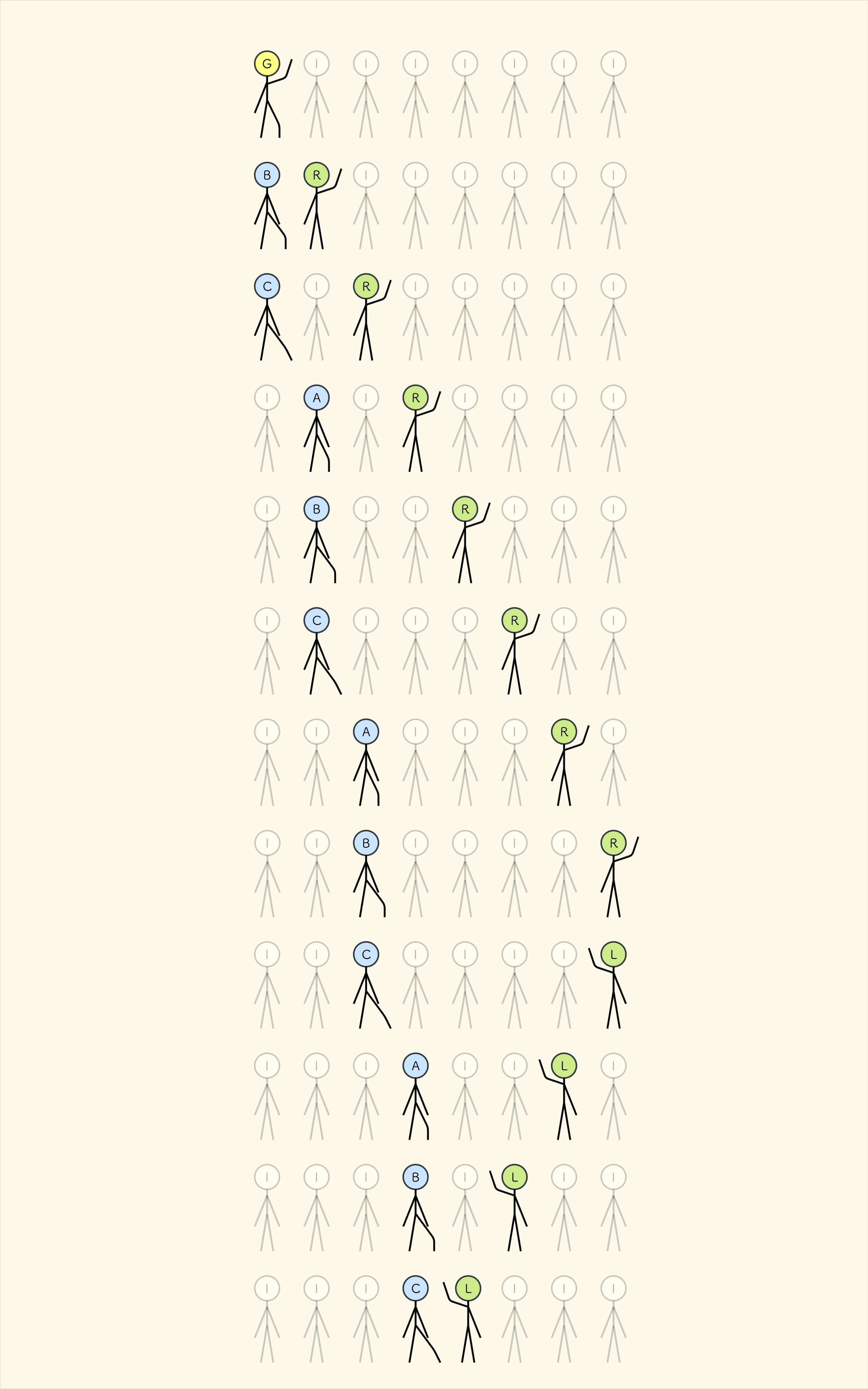 最开始的时候,让队头的士兵举右手、抬右腿,此时称他是一个将军 General,即处于 G 状态; 同样,对于举左手、抬左腿的情况,也是 G 状态。 凡是手脚并用的情况,都叫将军状态。