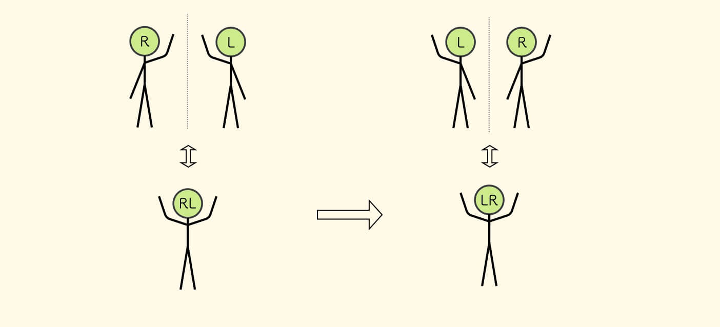 其中,可以看到两个新的状态 RL 和 LR ,这两个组合状态,也可以看做两个士兵的综合, 状态转变就是交换左右手,不再赘述。