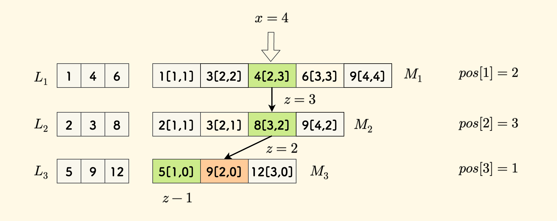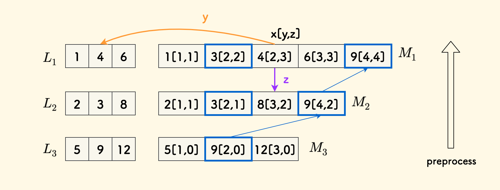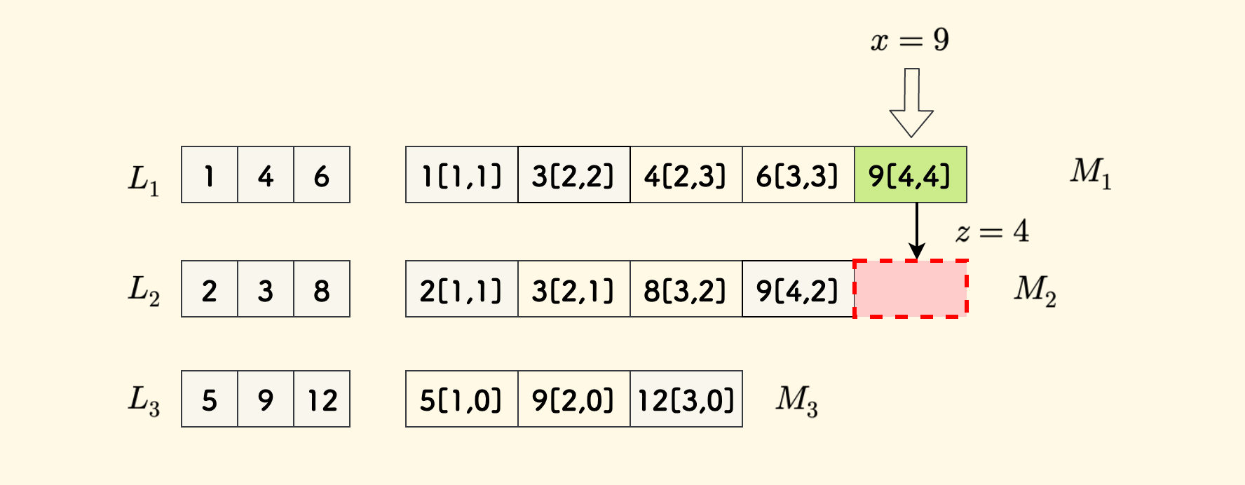 比如说,$M_1$ 中的 $4[2,3]$ 的 $y$ 字段是 $2$,指向 $L_1$ 中的第 $2$ 个元素 $4$。$z$ 字段是 $3$ 指向 $M_2$ 中的第 $3$ 个元素 $8$。